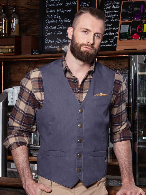 Gilet da uomio Jeans, unisce lo stile urbano all´eleganza classica, cuciture trapuntate a contrasto per un perfetto vintage look, forma leggermente stretta in vita con pinces, elevata resistenza al lavaggio contro lo sporco più ostinato, cinta sul retro della vita regolabile mediante la fibbia, 5 bottoni a pressione, 2 taschini a filetto laterali e 1 taschino sul petto.