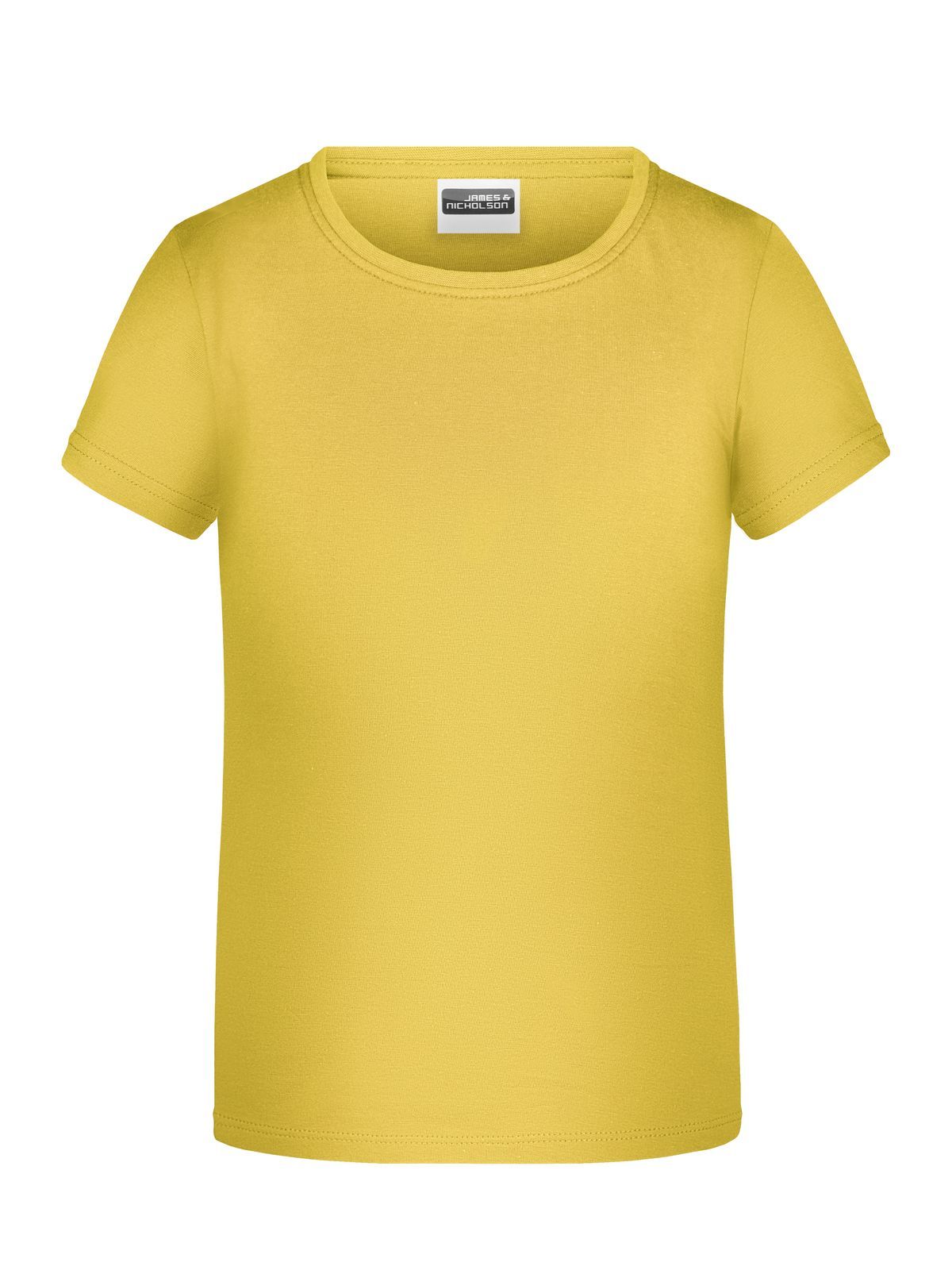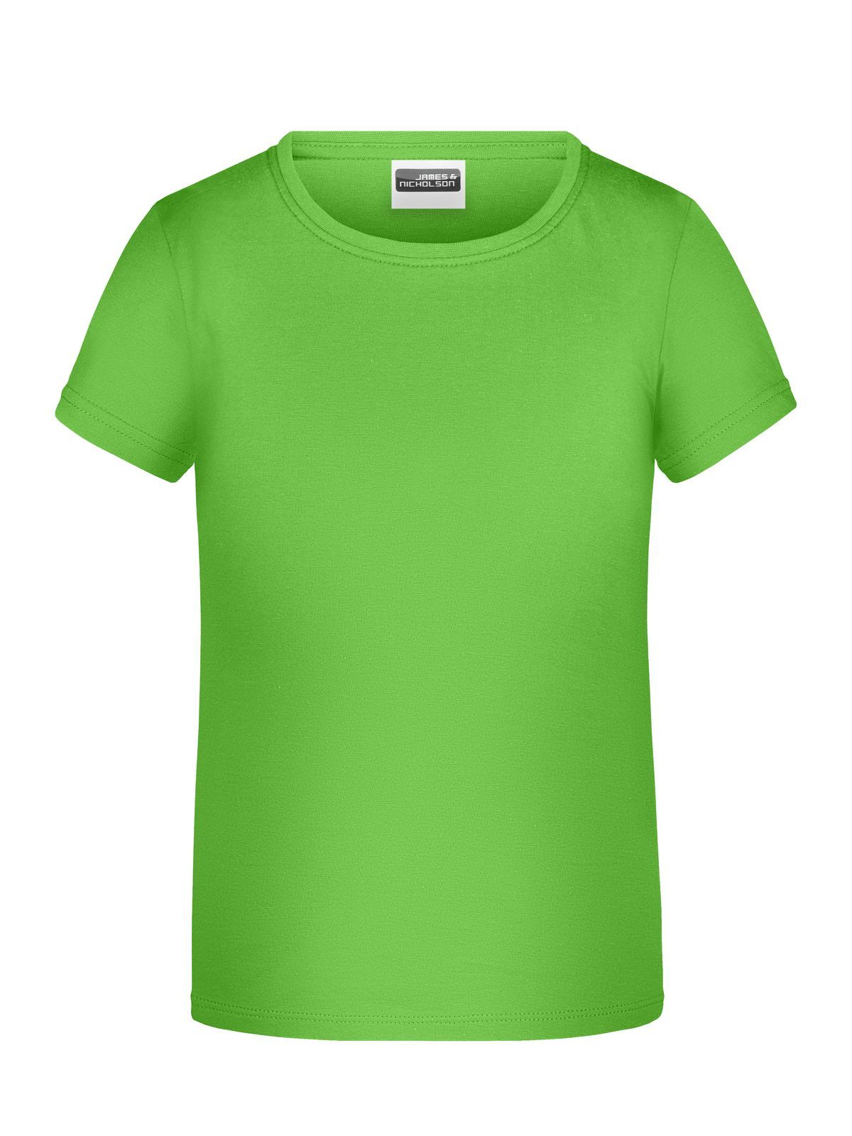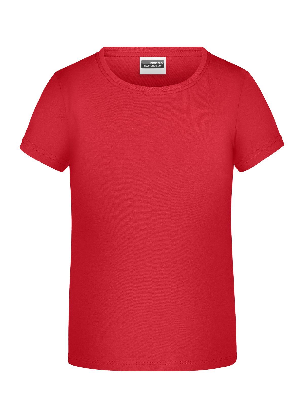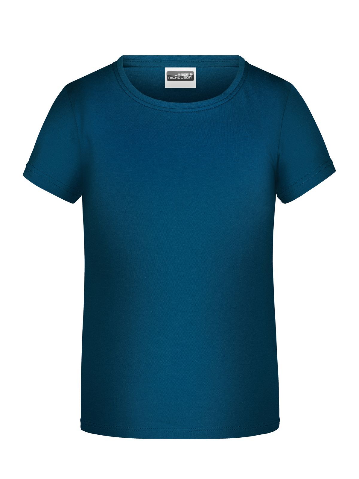 T-shirt girocollo da bambino con elastico al collo in elastane, leggermente sfiancata, etichetta removibile. Busto tubolare.
