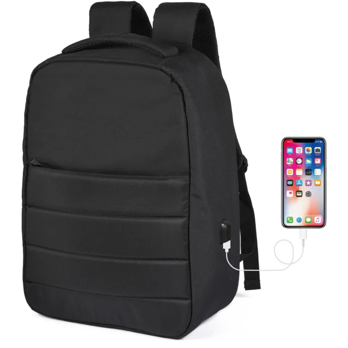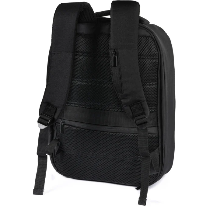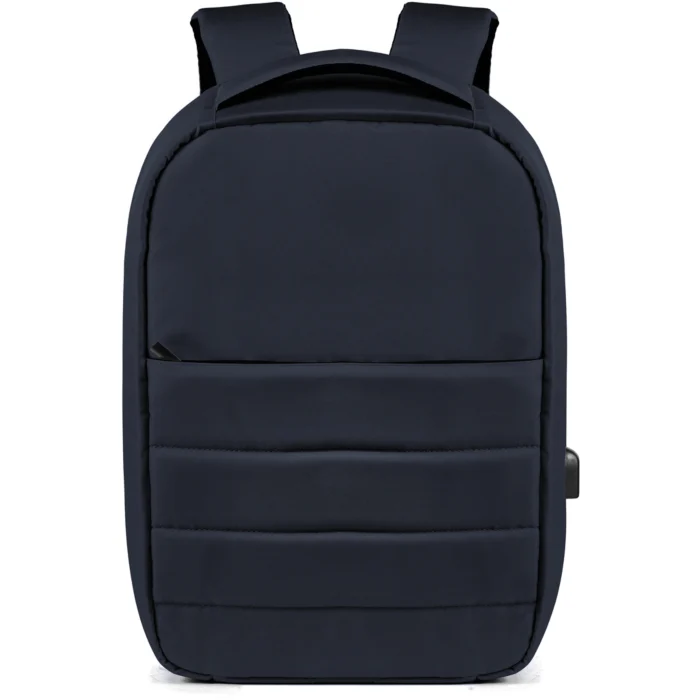 Cerniere nascoste, tasca frontale imbottita, ampio scomparto principale, doppio scomparto interno imbottito per portatile e tablet. Schienale imbottito con materiale traspirante con tasca e cinta per consentire l’inserimento del manico di un trolley, spallacci imbottiti con materiale traspirante. Piccolo taschino su un solo spallaccio. Con uscita integrata USB.