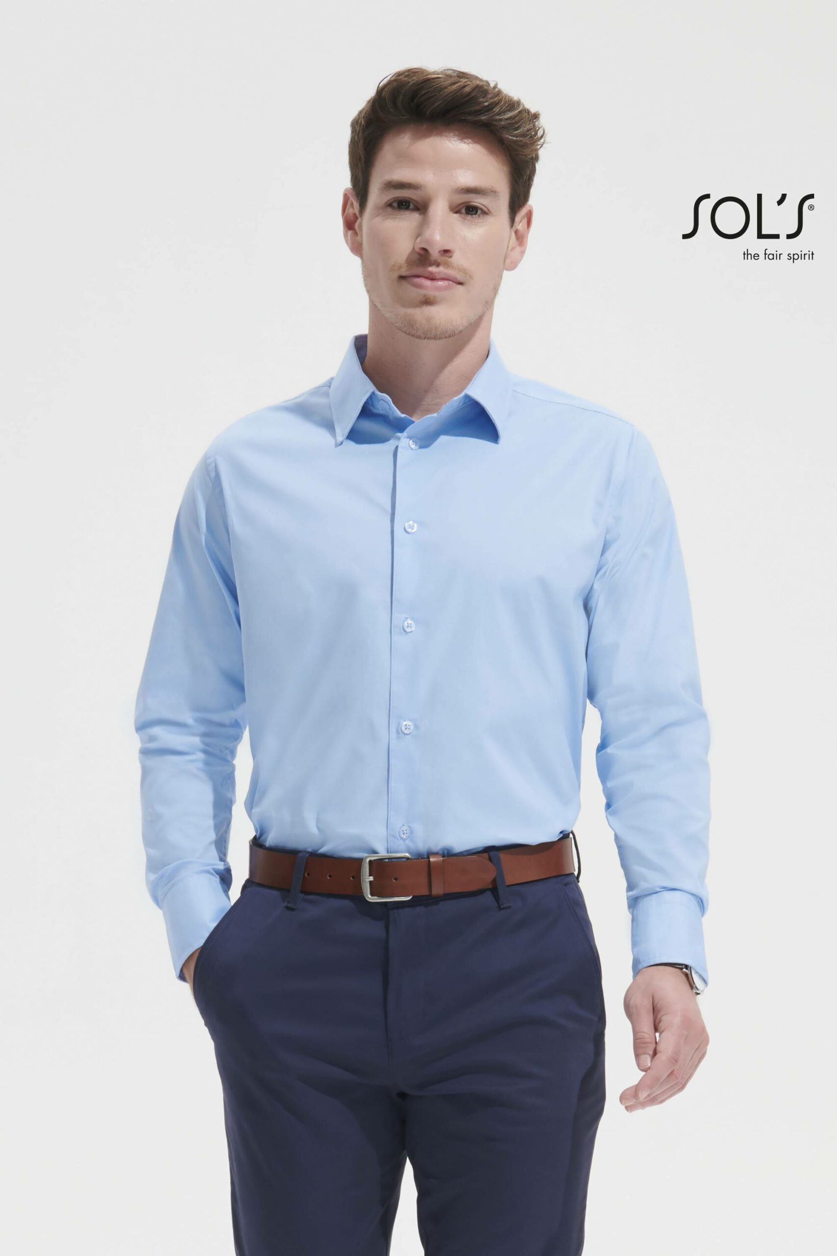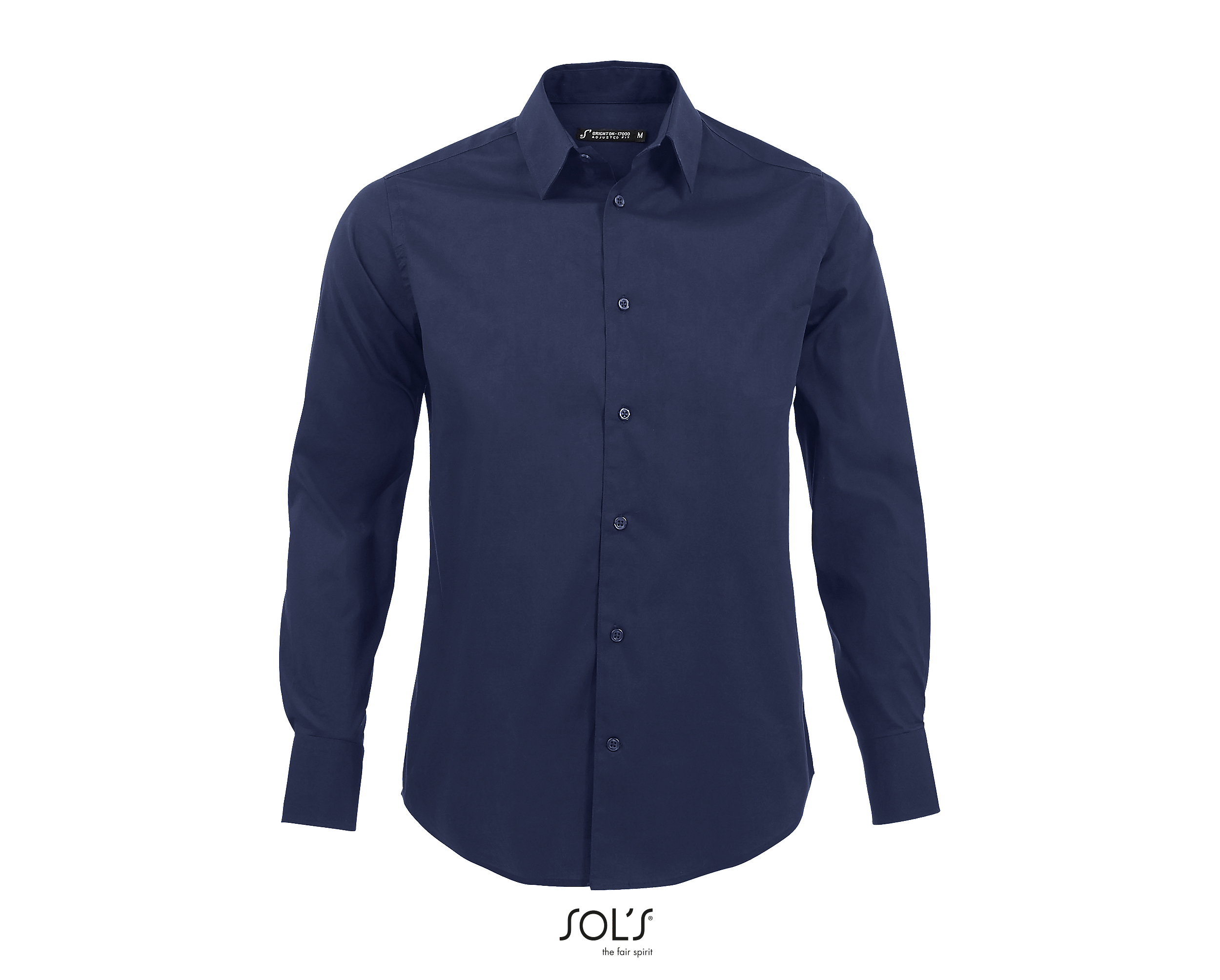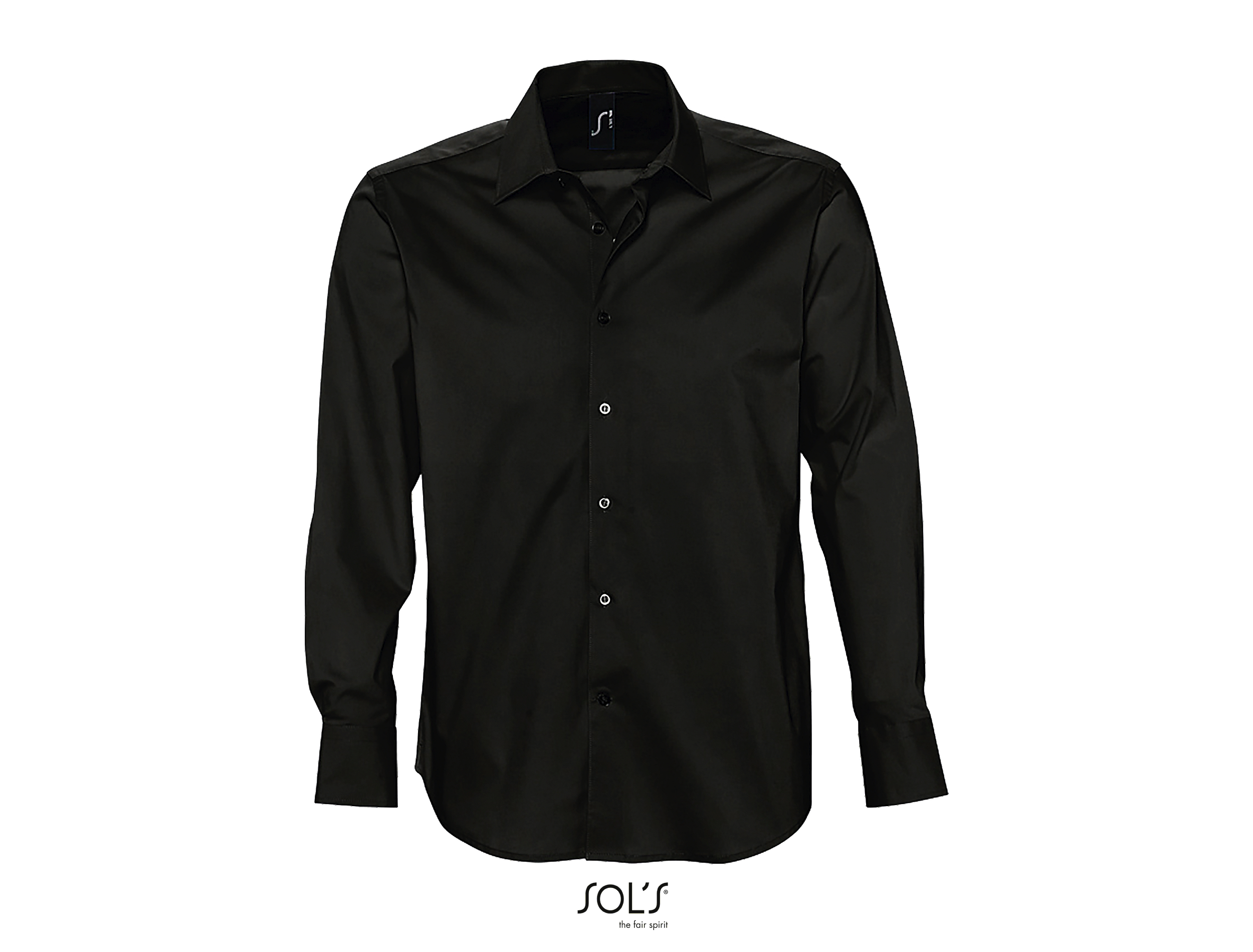 Taglio aderente, collo italiano semi-aperto con bottone unico, patta con 7 bottoni in tinta, polsino regolabile con 2 bottoni in tinta.