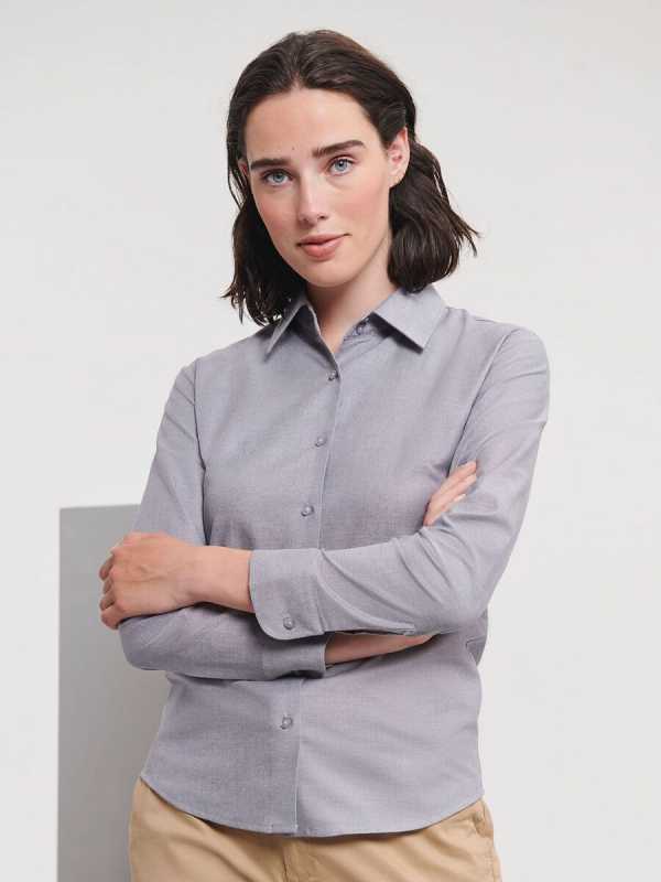 Camicia da donna con pince sul dietro e al seno per una perfetta vestibilità, taglio leggermente sfiancato. Polsino stondato regolabile, orlo stondato. Bottone di ricambio. (Col. 30: 130g/m²).