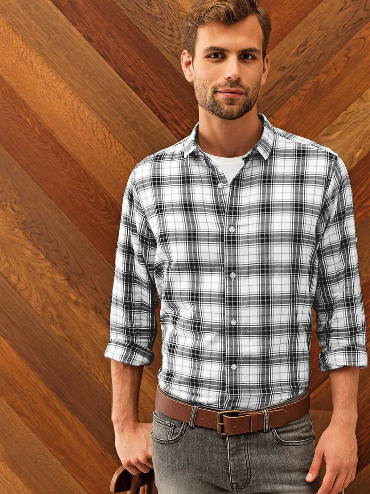 Camicia uomo a maniche lunghe con linguetta interna creata per poter rimboccare e chiudere la manica arrotolata sull’avambraccio. Vestibilita’ medium fit.