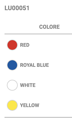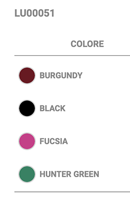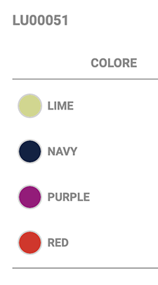 | Colori | Black, Burgundy, Lime, Navy, Purple, Red, Royal Blue, White, Yellow, Fucsia, Hunter Green |