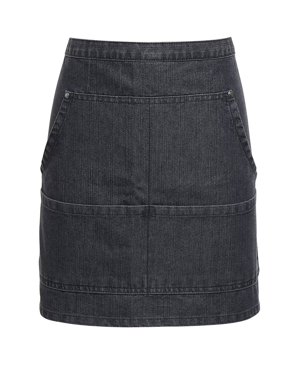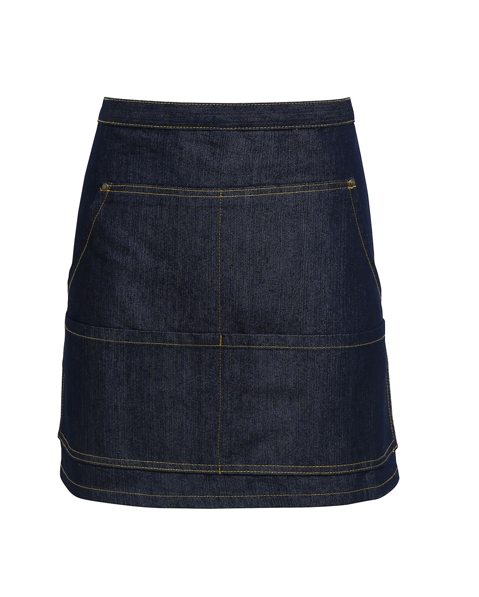 Grembiule in denim stile bar, cuciture a contrasto, inserti in rame, quattro tasche, cordino per chiusura (106 cm), lavabile a 60°C.