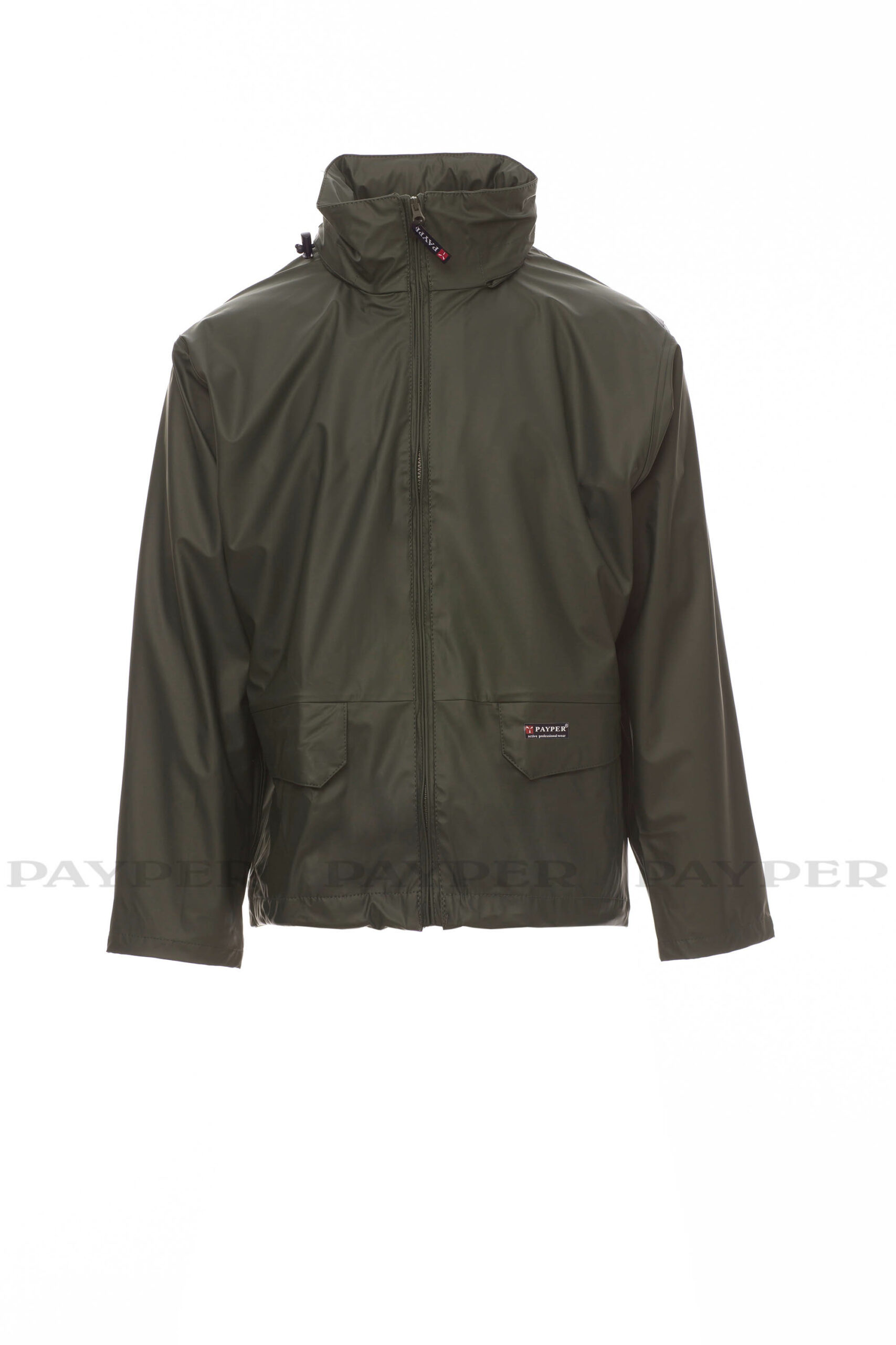 Giacca antipioggia, zip intera coperta, in plastica con cursore in metallo, cappuccio richiudibile nel colletto, polsini regolabili con bottoni automatici, coulisse su fondo, due tasche a busta, cuciture termosaldate.