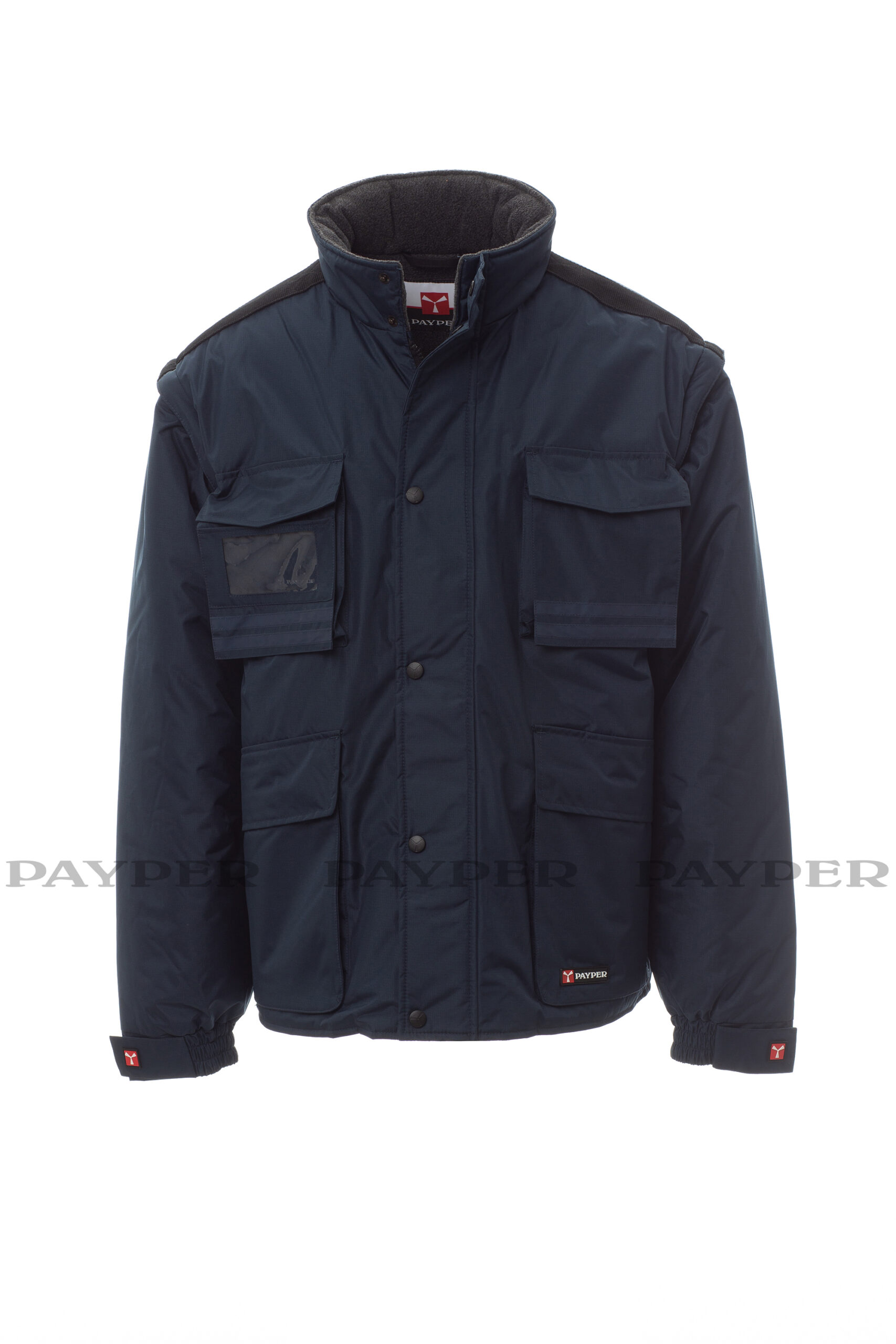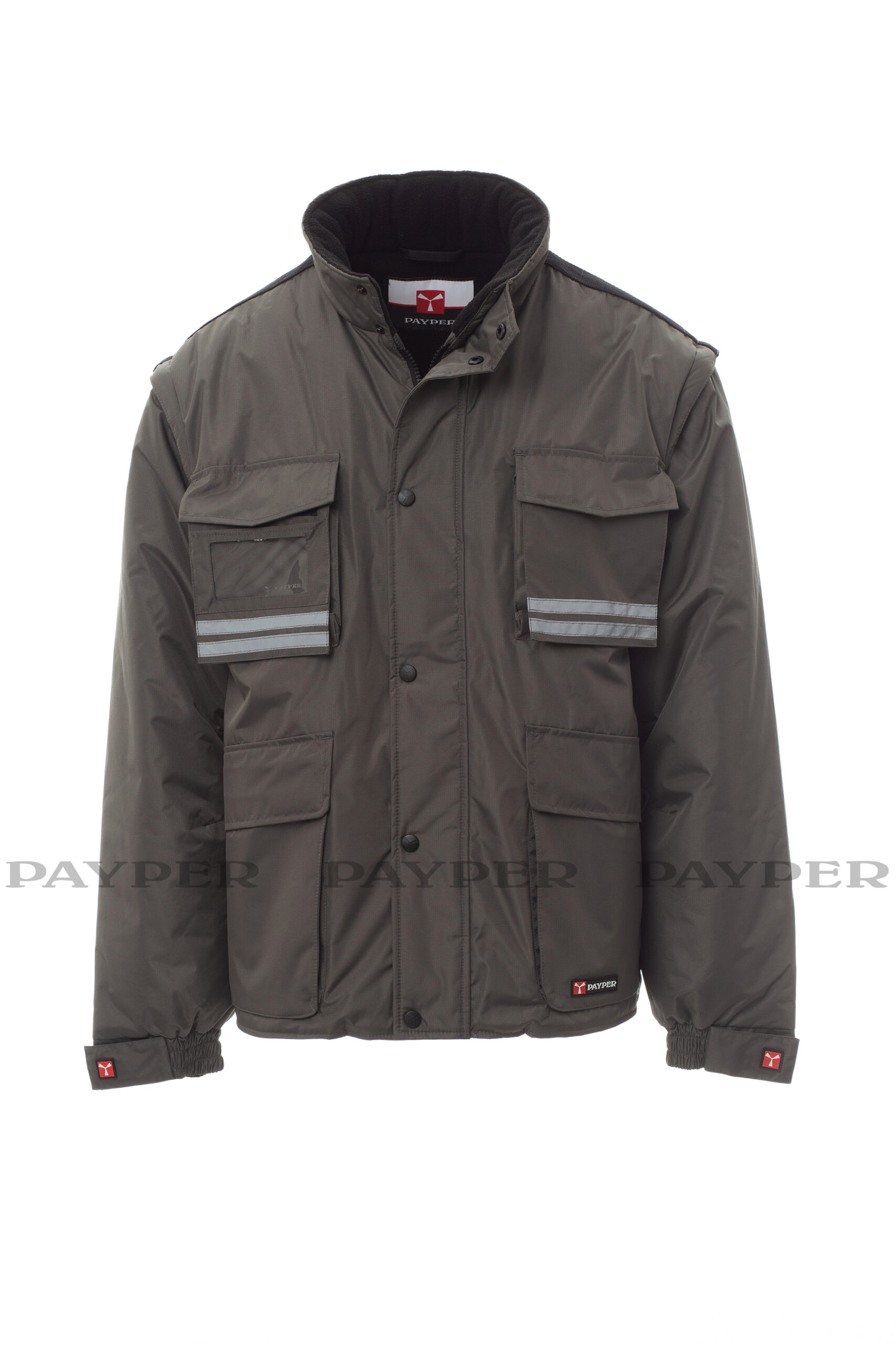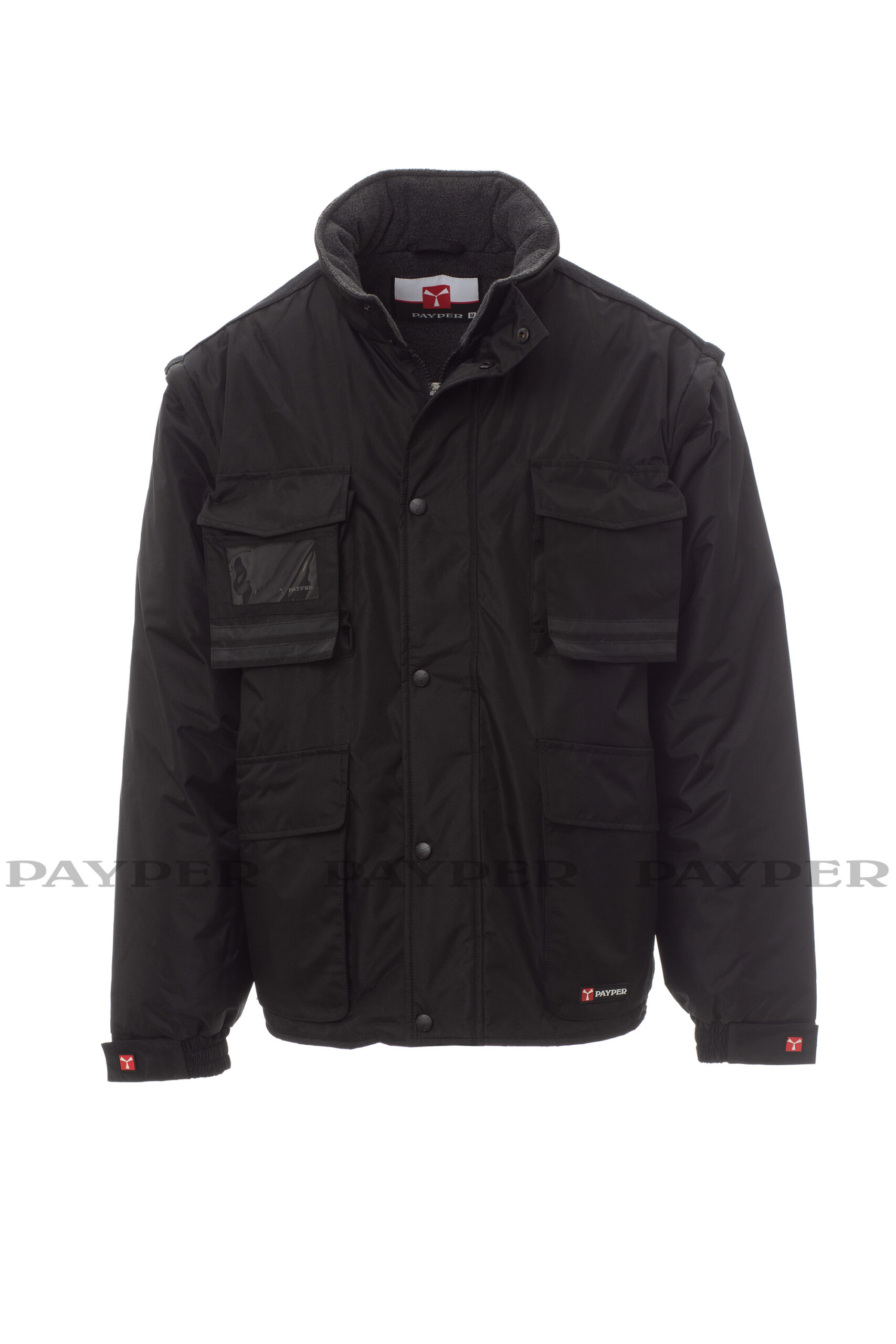 Giubbotto da uomo maniche staccabili, con pinces cucite e ribattute al loro interno. Zip da 5mm in plastica con cursore in metallo con patta e bottoni in plastica, cappuccio richiudibile nel colletto, polsini regolabili, bande riflettenti in tinta fronte e retro, spacchetto laterale con soffietto e zip. Cinque tasche esterne di cui una porta badge reversibile. Interno imbottito, colletto schiena e scalda reni in micropile, inserti traspiranti sottobraccio, coulisse in vita e zip interna per agevolare stampe e ricami.