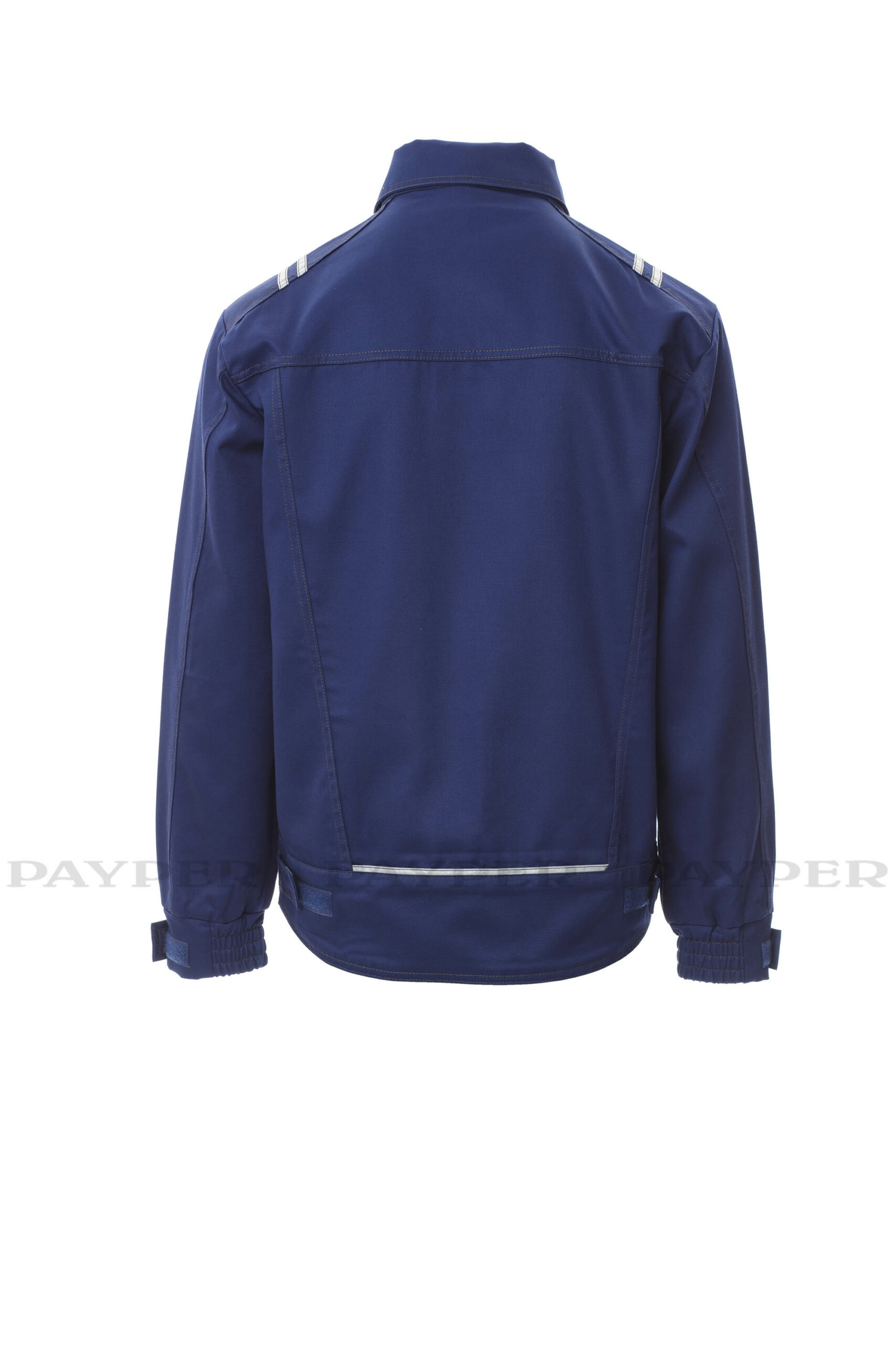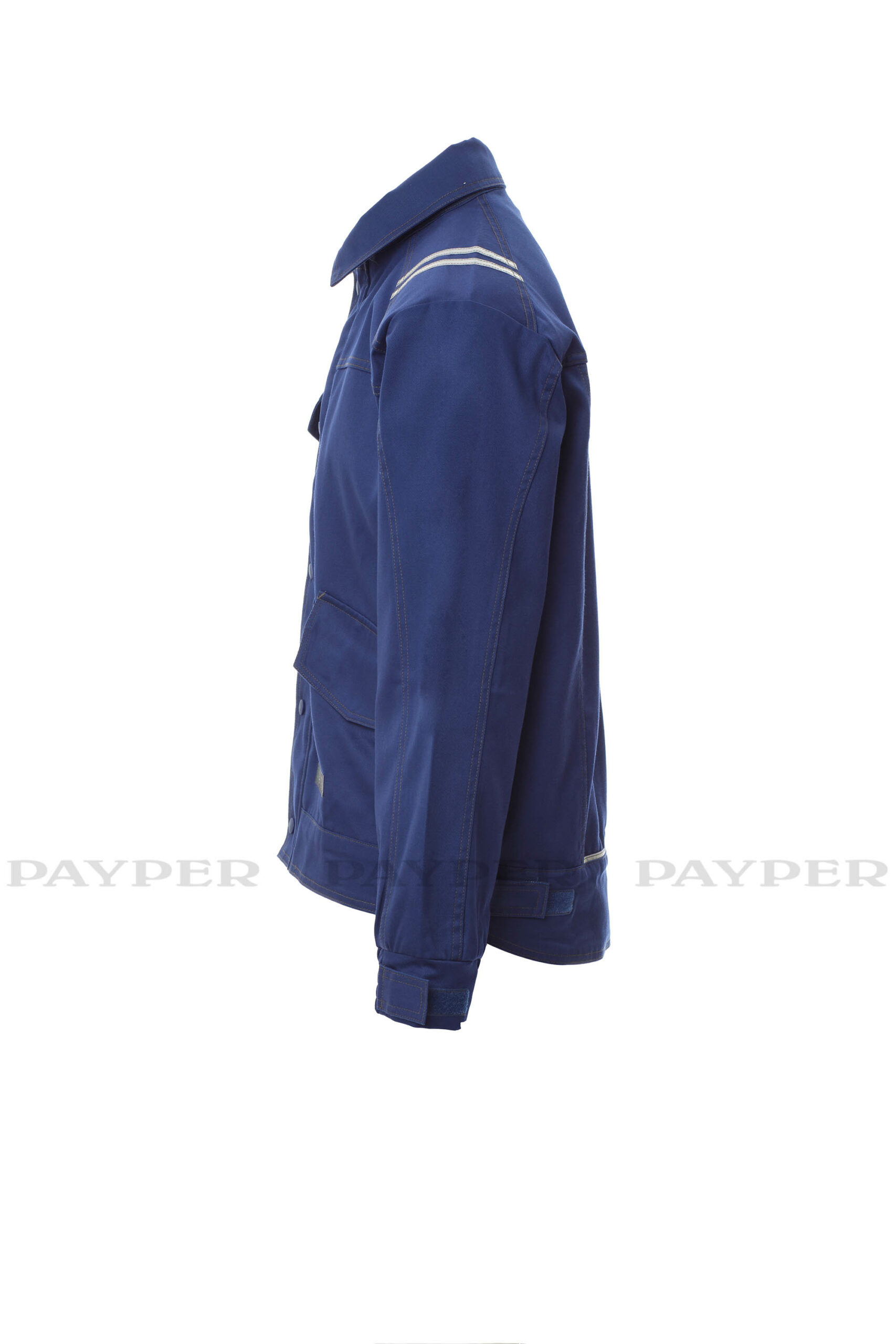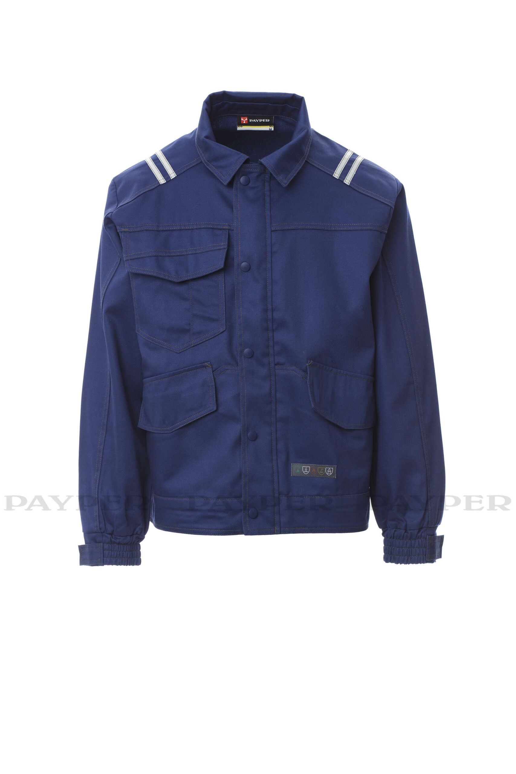 Giubbotto tipo jeans in cotone antistatico, antiacido, ignifugo, resistente all’arco elettrico ed adatto ai saldatori, doppie cuciture in contrasto e rinforzate su maniche, fianco e dietro. Due tasconi in vita e un taschino petto parte destra con porta penna tutti coperti da patta fermata con velcro. Fondo dietro sagomato per una migliore copertura e regolabile da velcro, maniche a giro con polsino elastico e alamaro con velcro per ulteriore regolazione. Zip davanti coperta da patta con bottoni a pressione. Bande 3M retroriflettenti applicate sulle spalle e nel fondo dietro. Portabadge in plastica staccabile.
