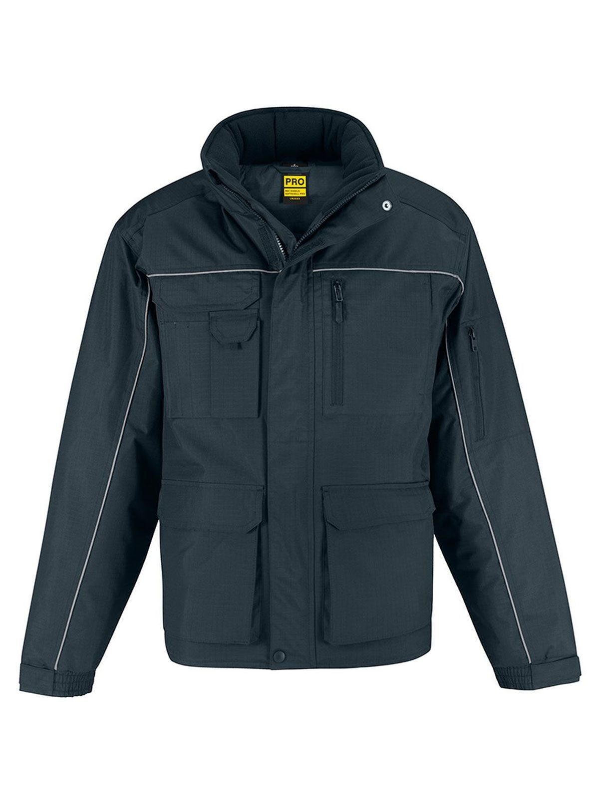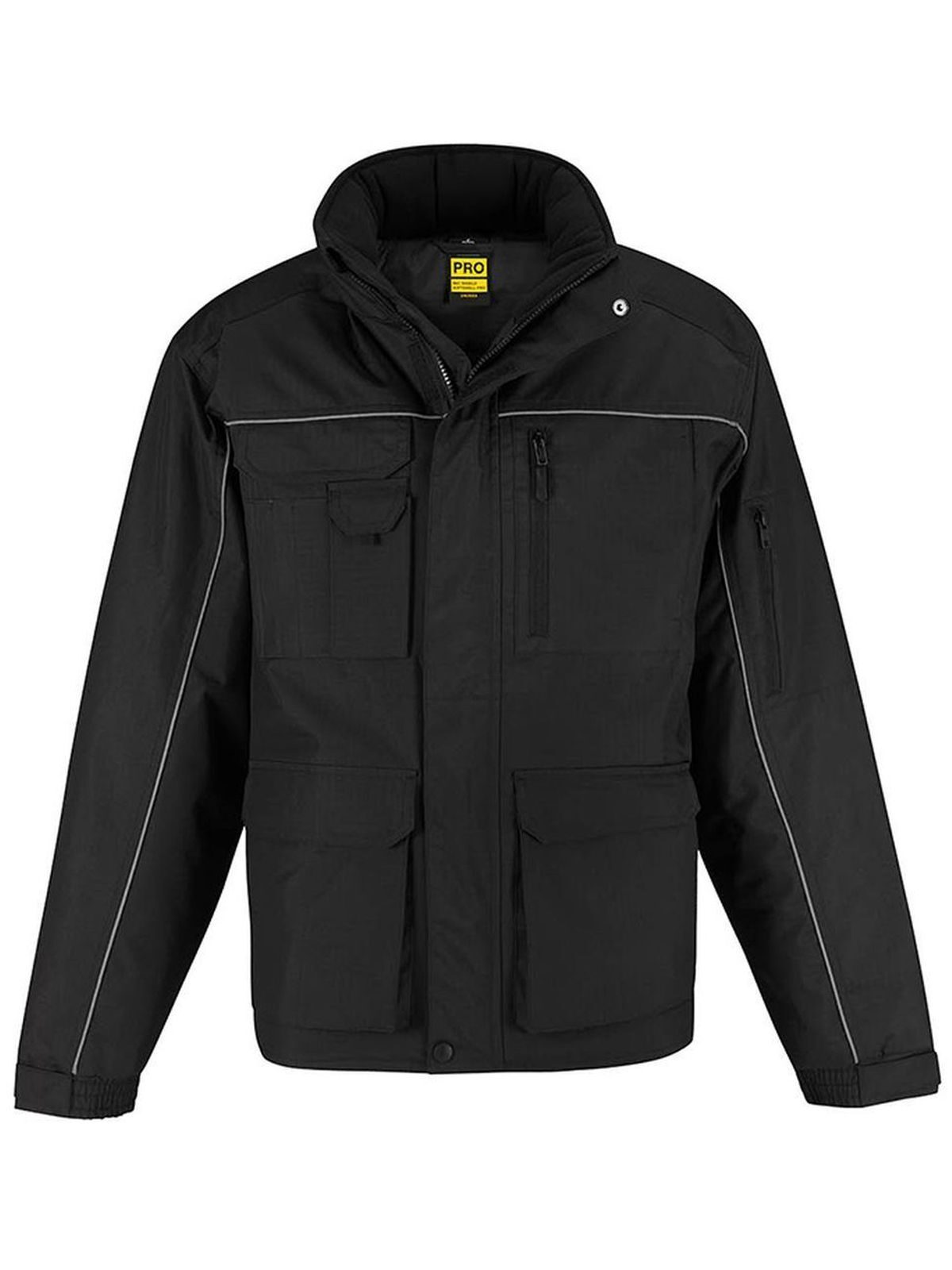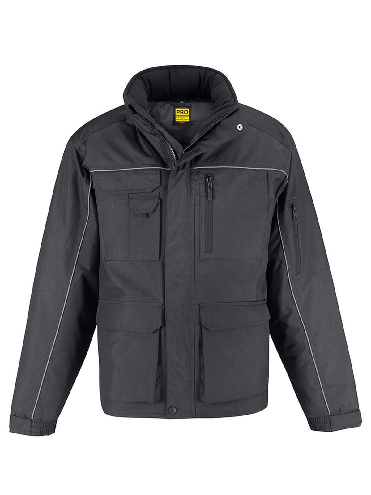 Giacca pesante, impermeabile 5000 mm, antivento, cappuccio a scomparsa nel colletto, struttura ergonomica, leggermente più lunga nella parte posteriore, protezione contro il freddo, dettagli catarifrangenti sia davanti che sul retro, adatta ad ogni tecnica di stampa e ricamo su tutta l’area, 12 tasche muntifunzionali.