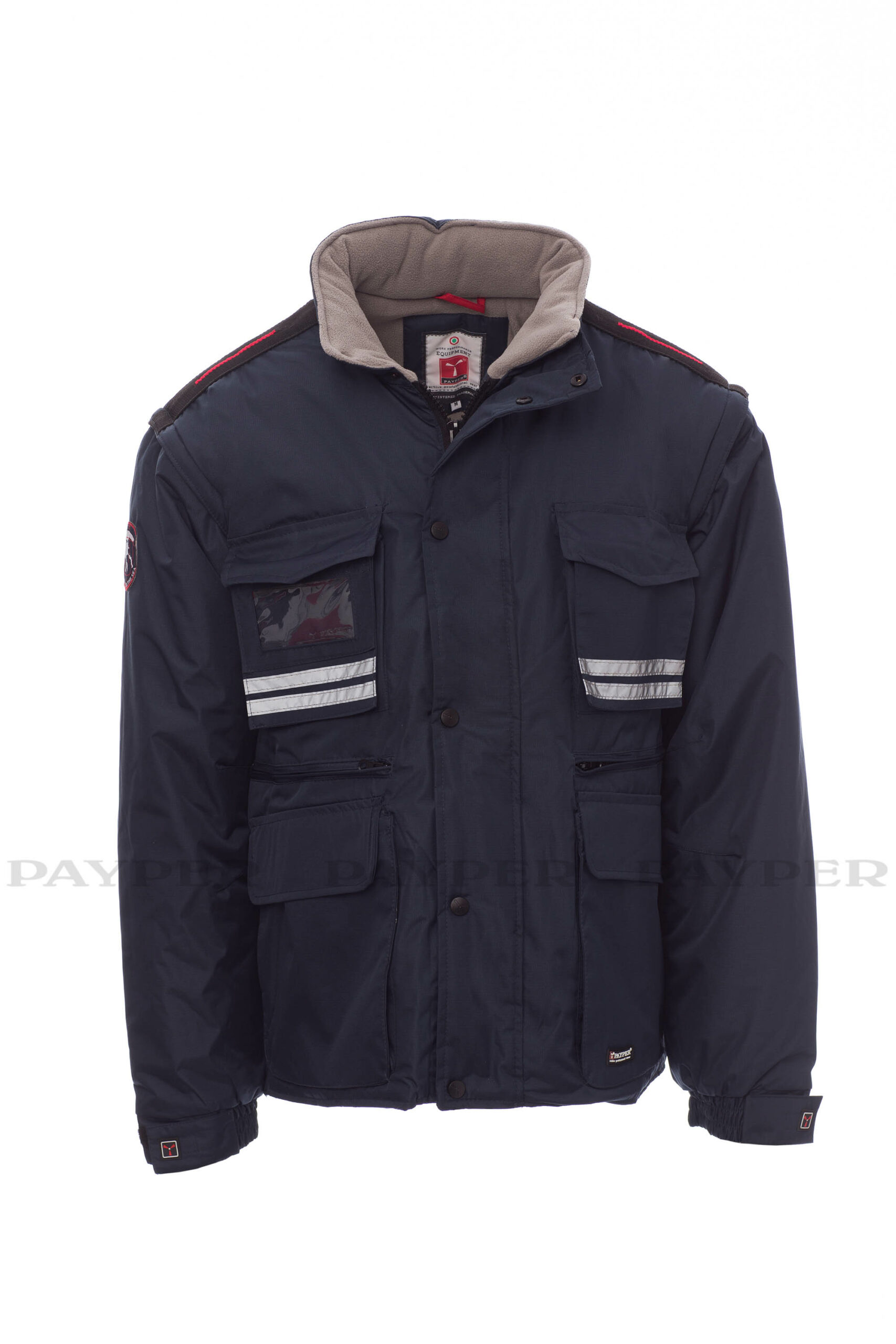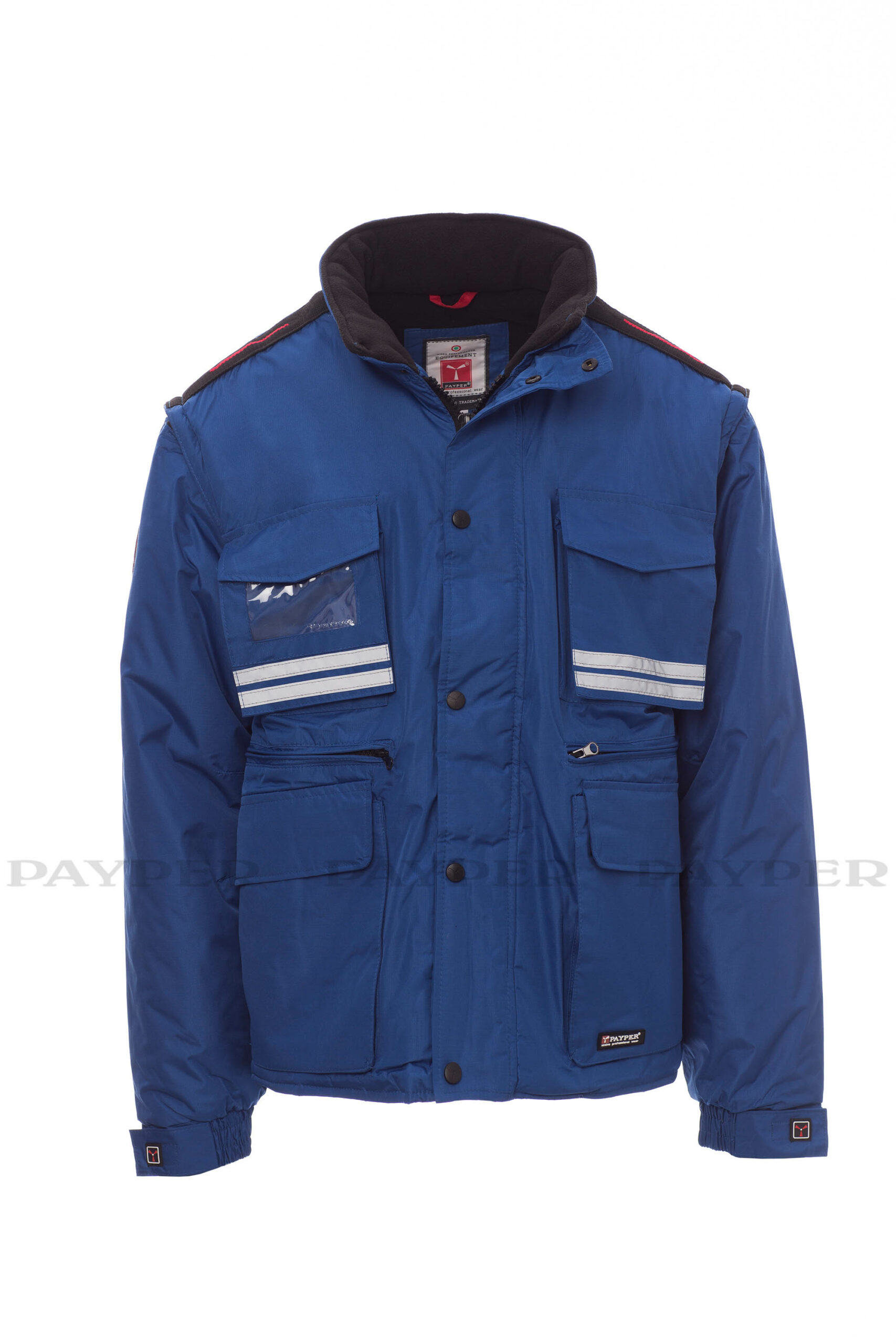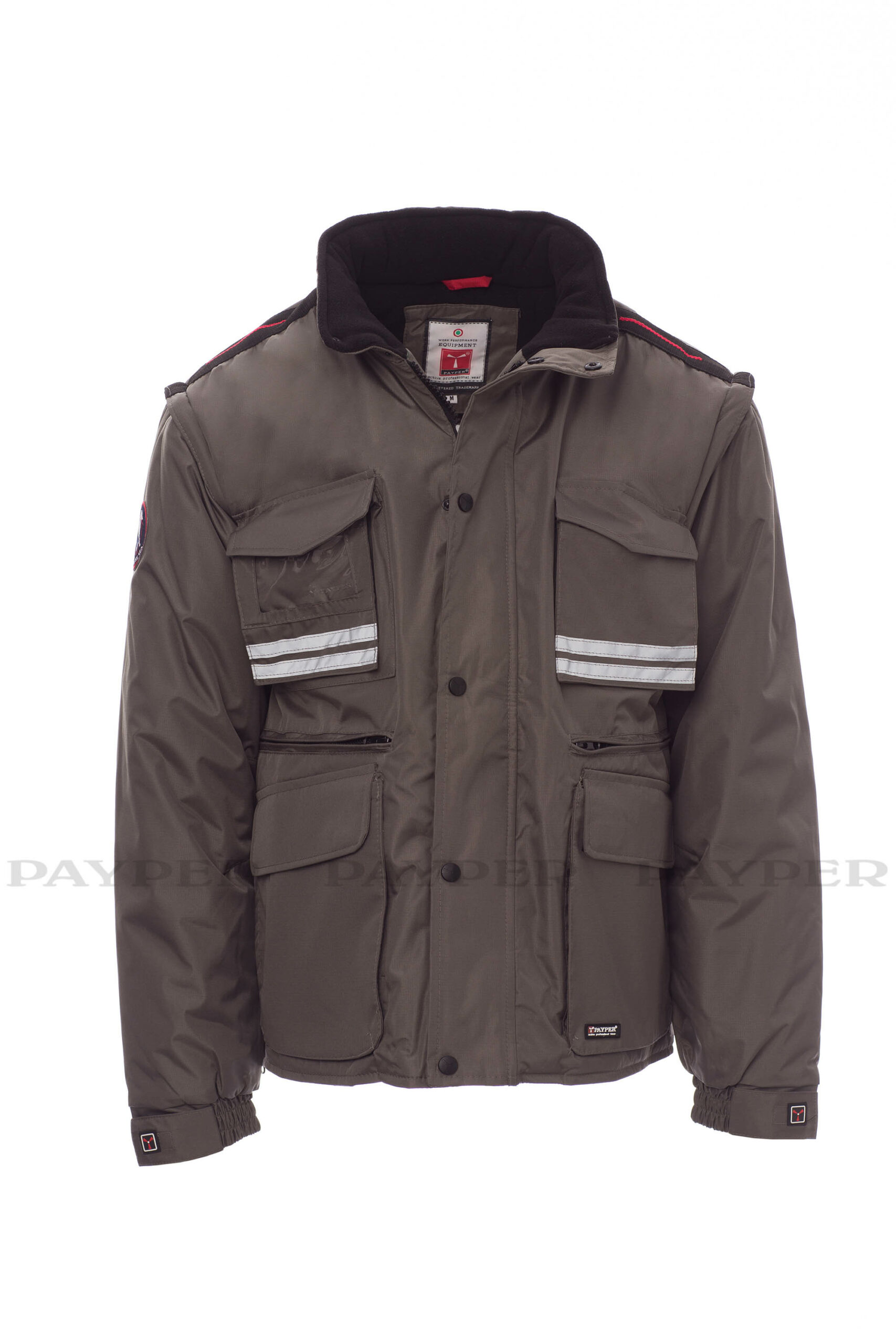 Giubbotto da uomo, maniche staccabili, zip 8 mm in plastica con cursore in metallo con patta e bottoni in plastica, cappuccio sagomato staccabile e/o richiudibile nel colletto, polsini regolabili, bande riflettenti grigie fronte e retro, gomiti preformanti e spacchetto laterale con soffietto e zip, nove tasche esterne di cui due LOCK SYSTEM, due con zip e interno rinforzato, una con porta badge reversibile. Interno: imbottito, colletto, schiena e scalda reni in micropile, inserti traspiranti sottobraccio, coulisse in vita e zip interna per agevolare stampe e ricami.