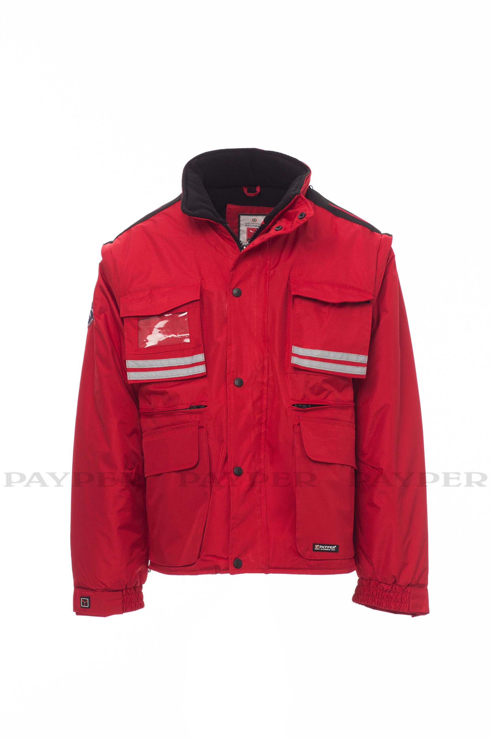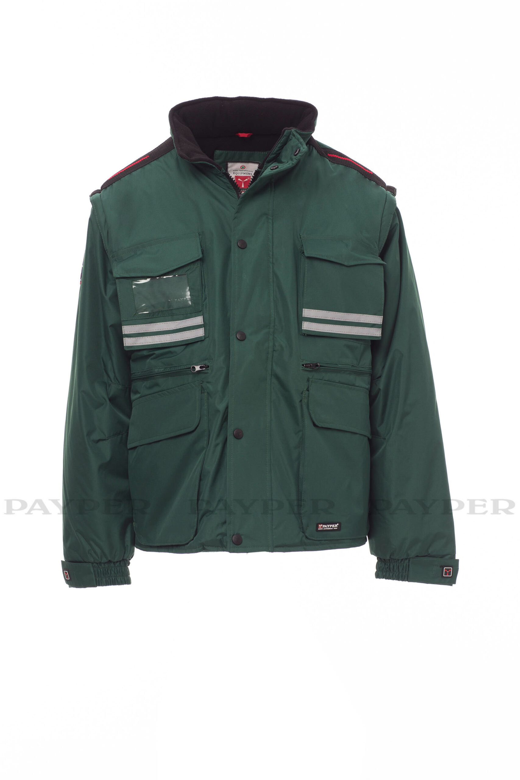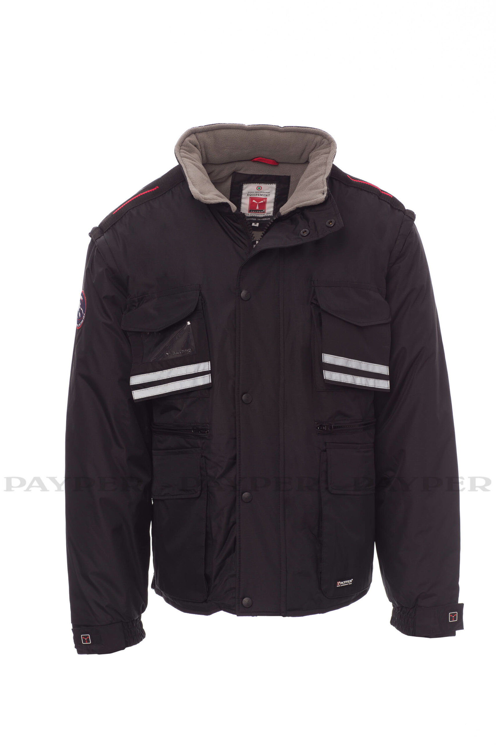 Giubbotto da uomo, maniche staccabili, zip 8 mm in plastica con cursore in metallo con patta e bottoni in plastica, cappuccio sagomato staccabile e/o richiudibile nel colletto, polsini regolabili, bande riflettenti grigie fronte e retro, gomiti preformanti e spacchetto laterale con soffietto e zip, nove tasche esterne di cui due LOCK SYSTEM, due con zip e interno rinforzato, una con porta badge reversibile. Interno: imbottito, colletto, schiena e scalda reni in micropile, inserti traspiranti sottobraccio, coulisse in vita e zip interna per agevolare stampe e ricami.