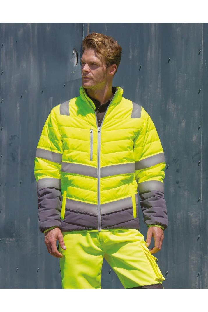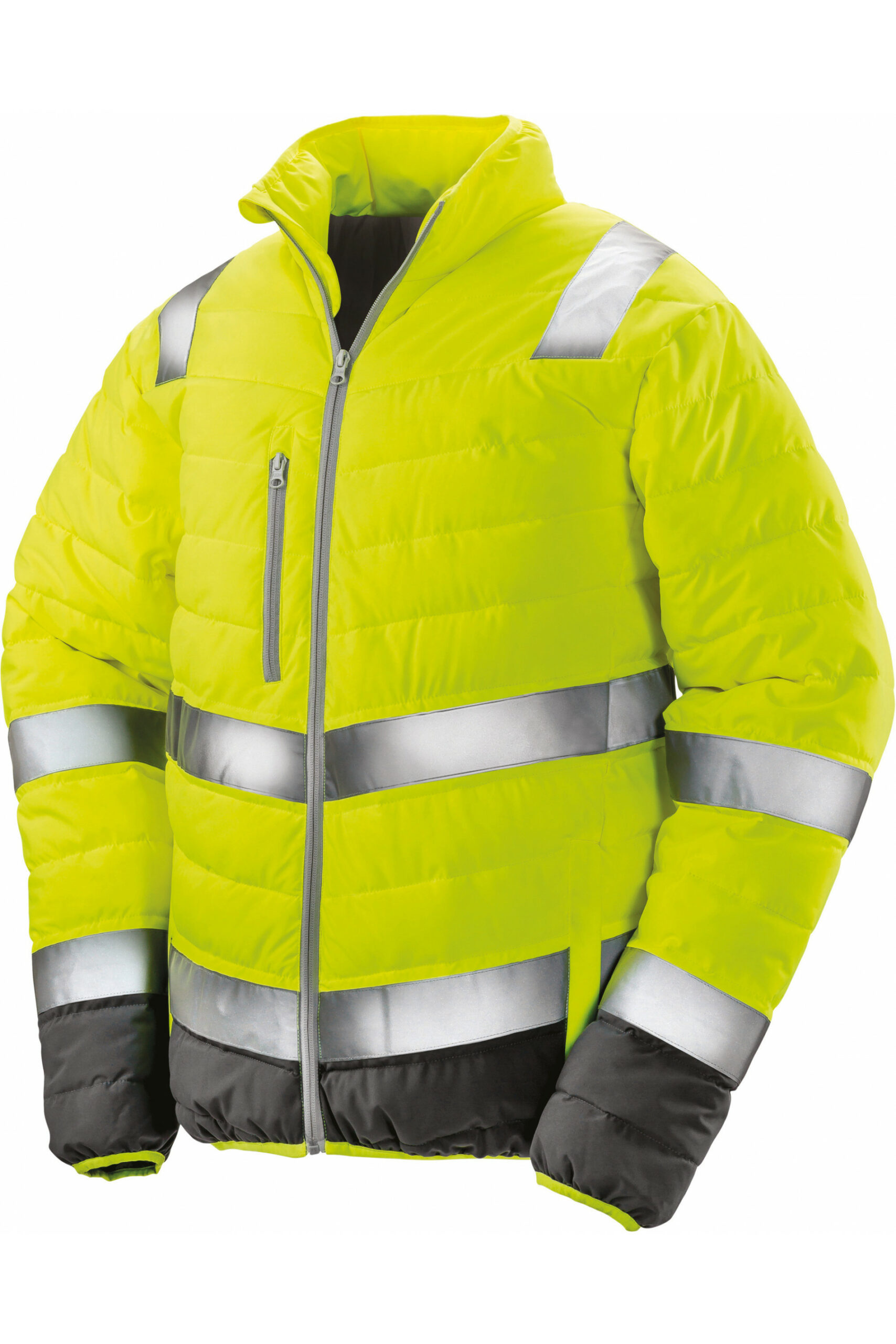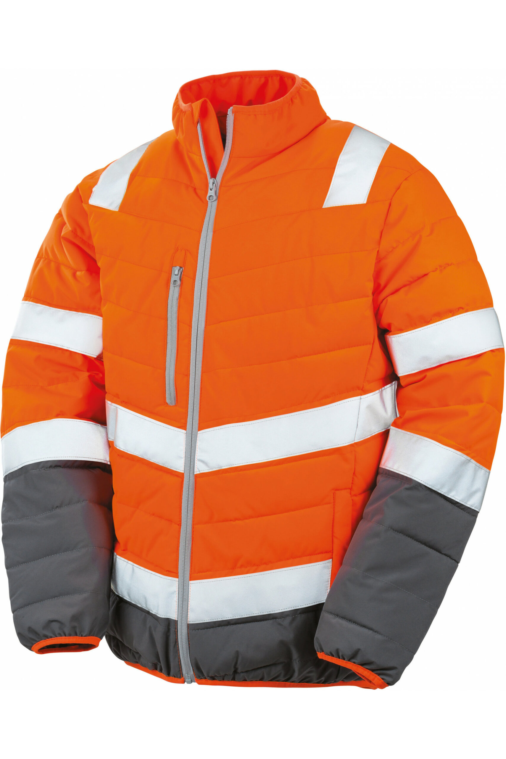 Membrana resistente alle sostanze abrasive. Morbido e stretch, confortevole da indossare. Tessuto traspirante. Imbottitura: 100% poliestere morbido. Fodera: 100% poliestere. Collo alto e parte posteriore più lunga. Zip YKK®. Fodera interna e finiture di color grigio. Inserto di colore scuro a fondo capo per nascondere le tracce di sporco. Fasce con stampa riflettente su spalle, corpo e maniche. Finitura con sbieco morbido su polsini e a fondo capo. Asola per appenderla. Tasca interna. Facile da riporre e compatta. Nessuna etichetta di marchio, per semplificare la personalizzazione.