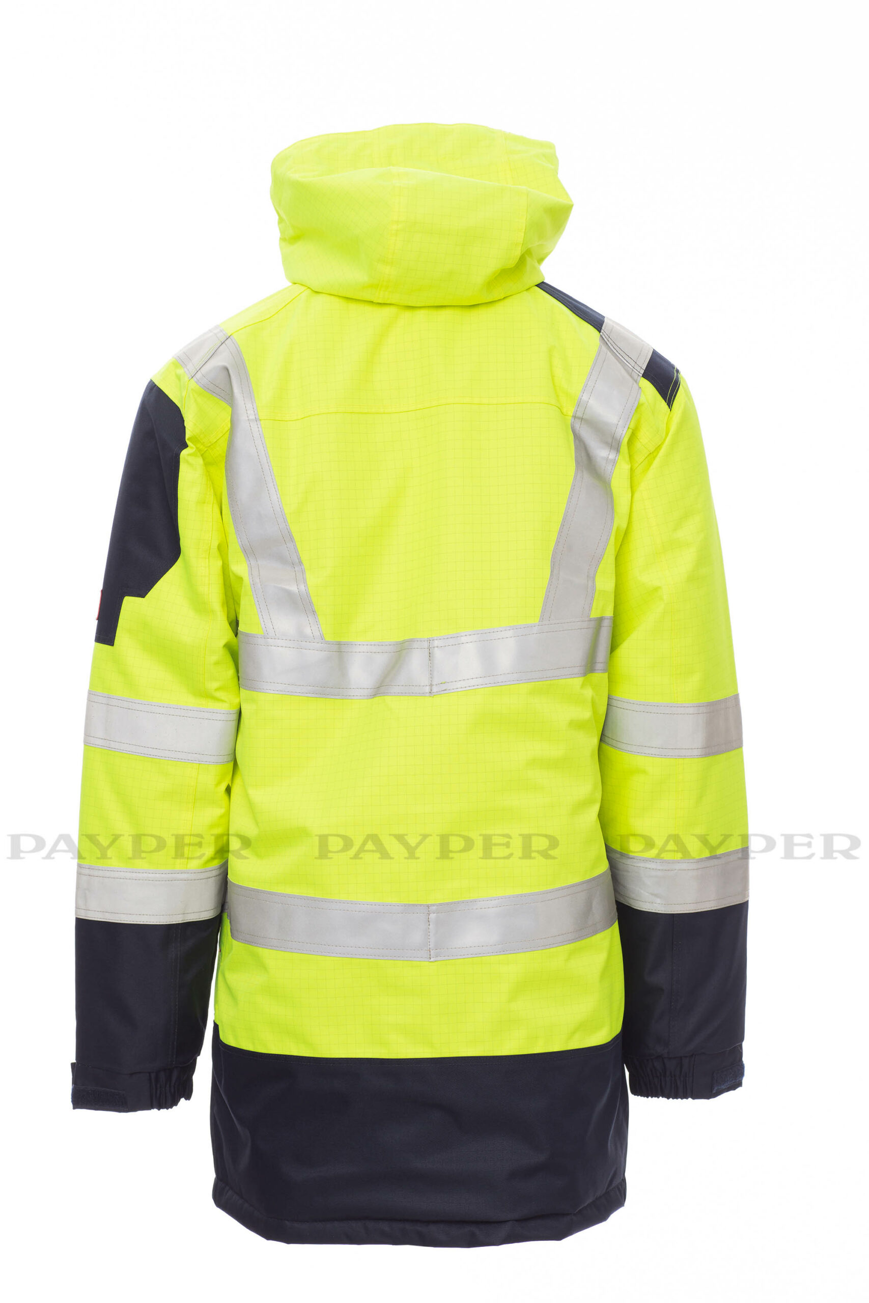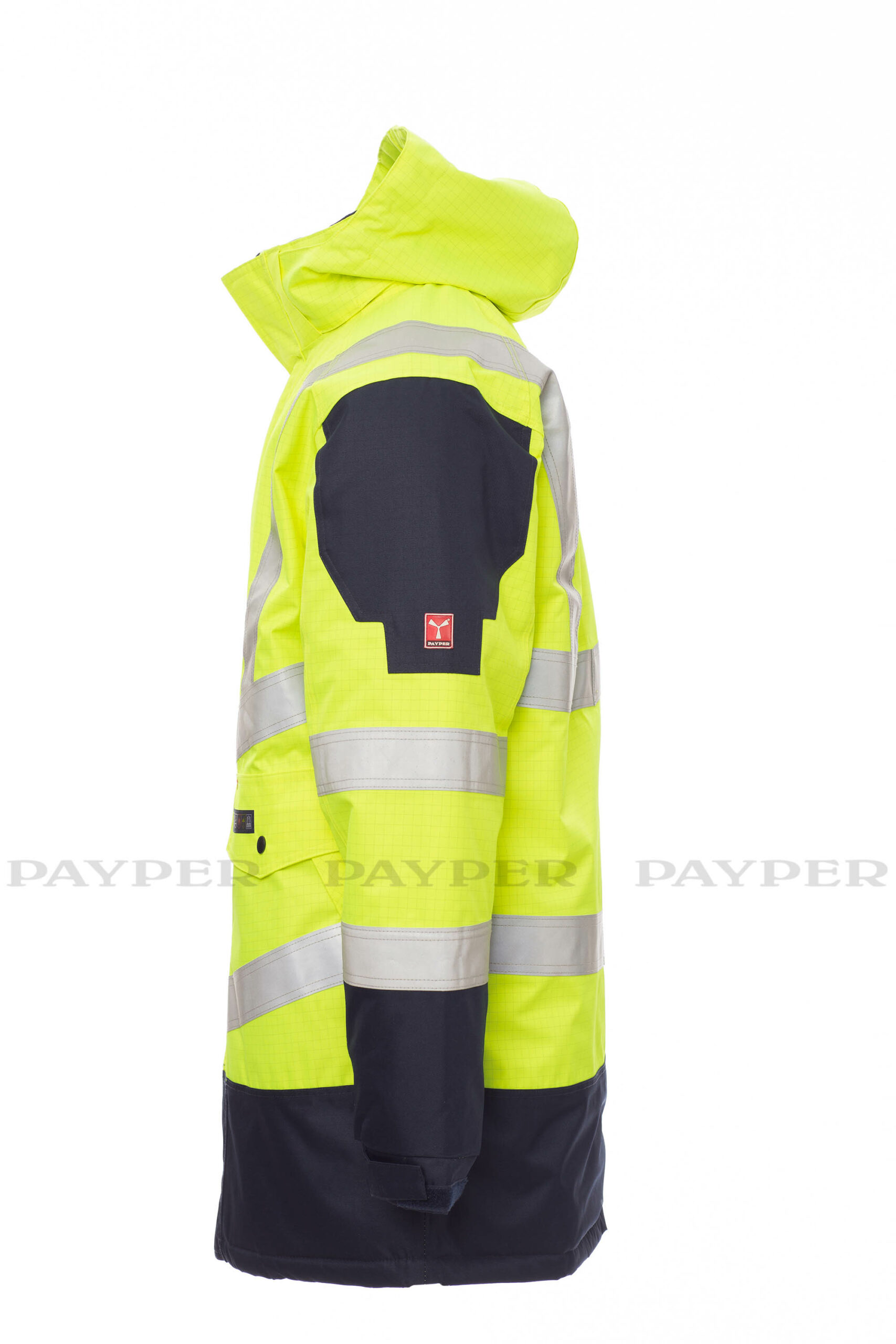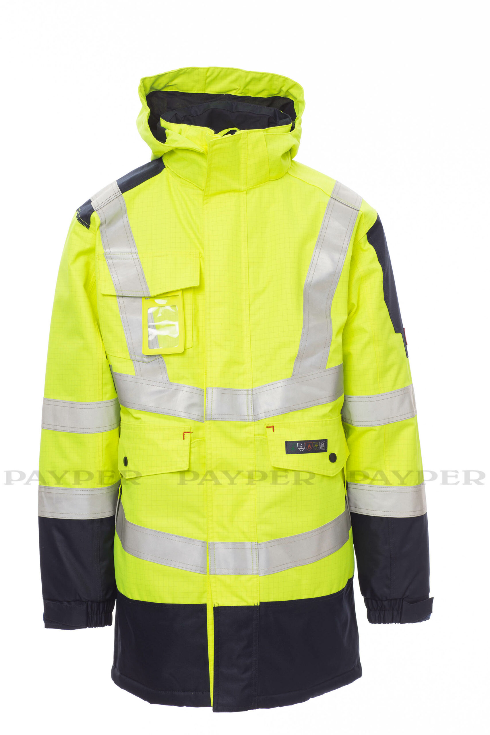 Parka MULTIPRO bicolore in alta visibilità, zip 8mm in plastica con cursore in metallo con patta e velcro, cappuccio staccabile, sagomato ed ergonomico con coulisse, polsino regolabile elasticizzato, ampie tasche frontali con patta e bottone, di cui due con zip, portabadge a scomparsa/staccabile. Interno: imbottito.