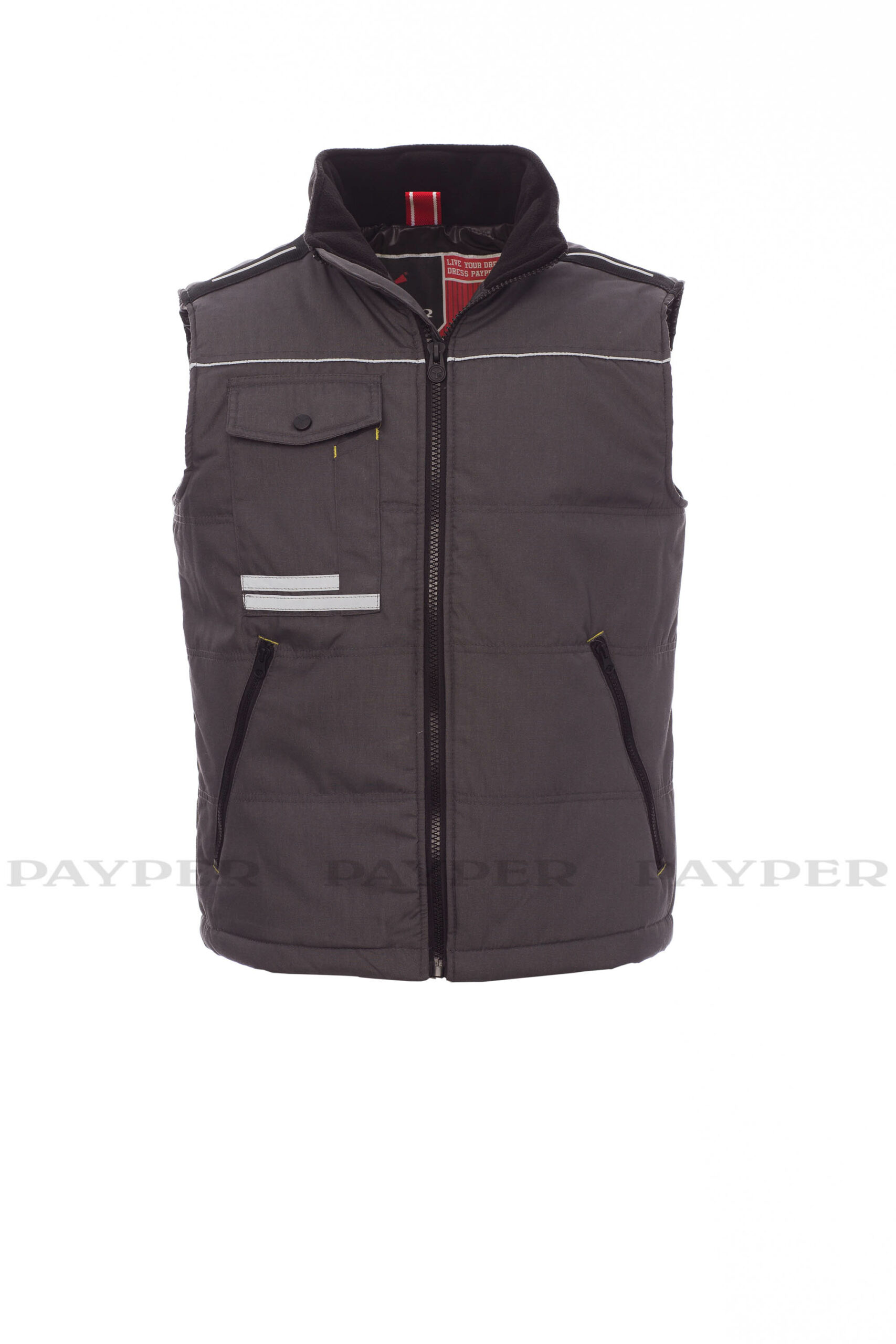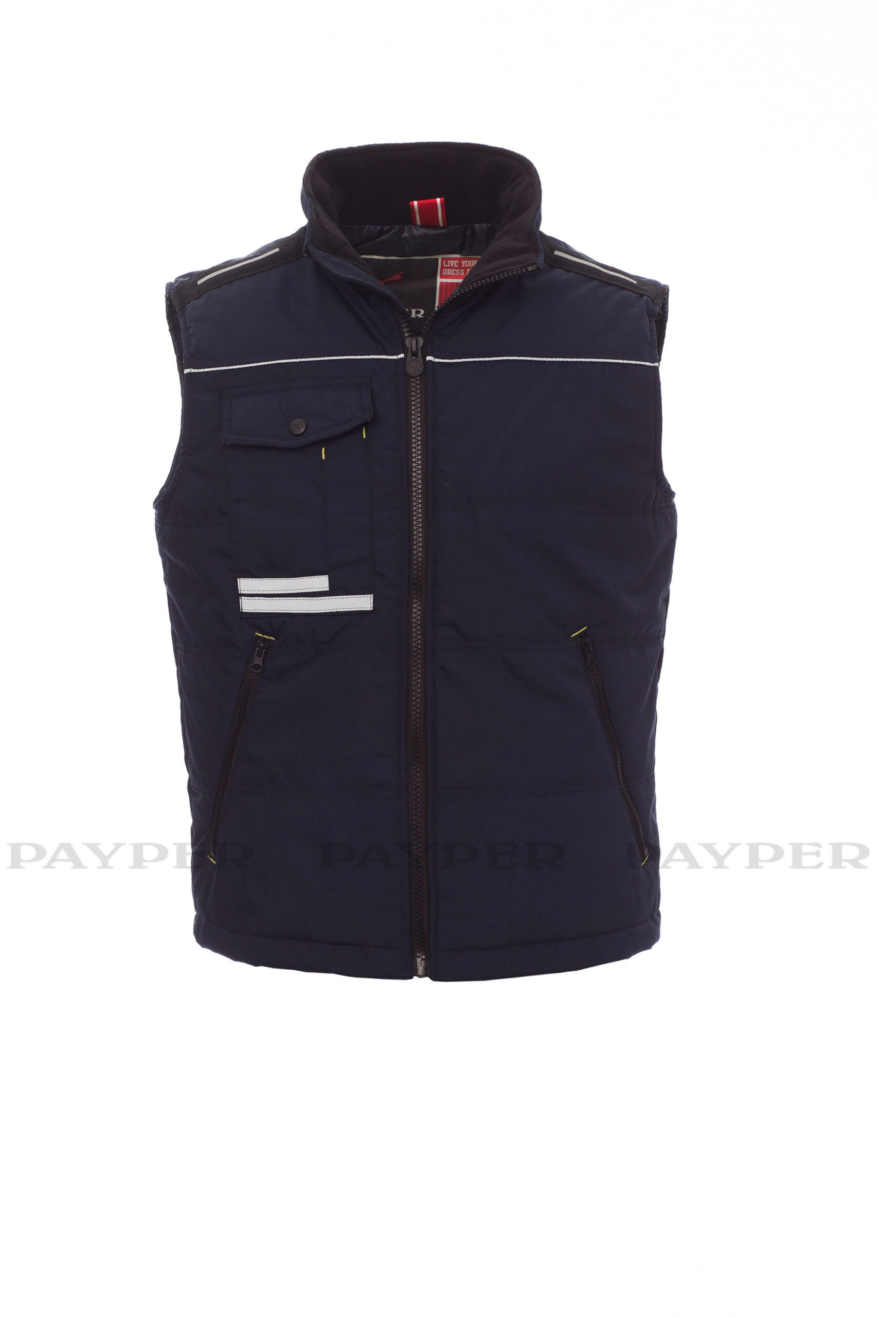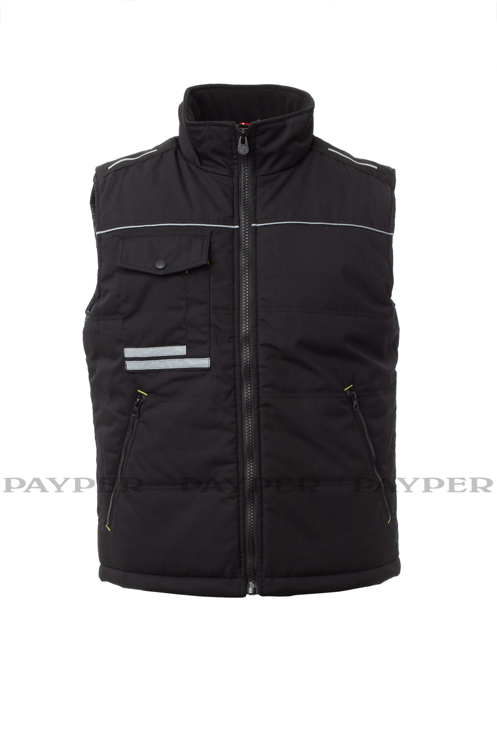 Gilet unisex, zip 8mm in plastica con cursore in metallo, retro sagomato, due ampie tasche esterne con zip, ampia tasca al petto multifunzione, porta smartphone e bande riflettenti, anello porta badge. Interno: imbottitura trapuntata e rifinita con fodera ad alta densità, interno colletto in pile, una tasca.