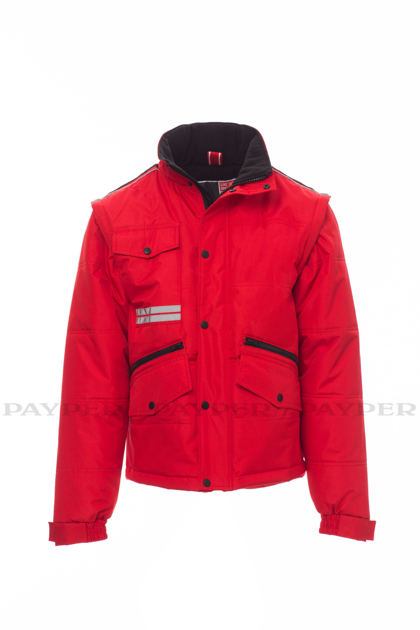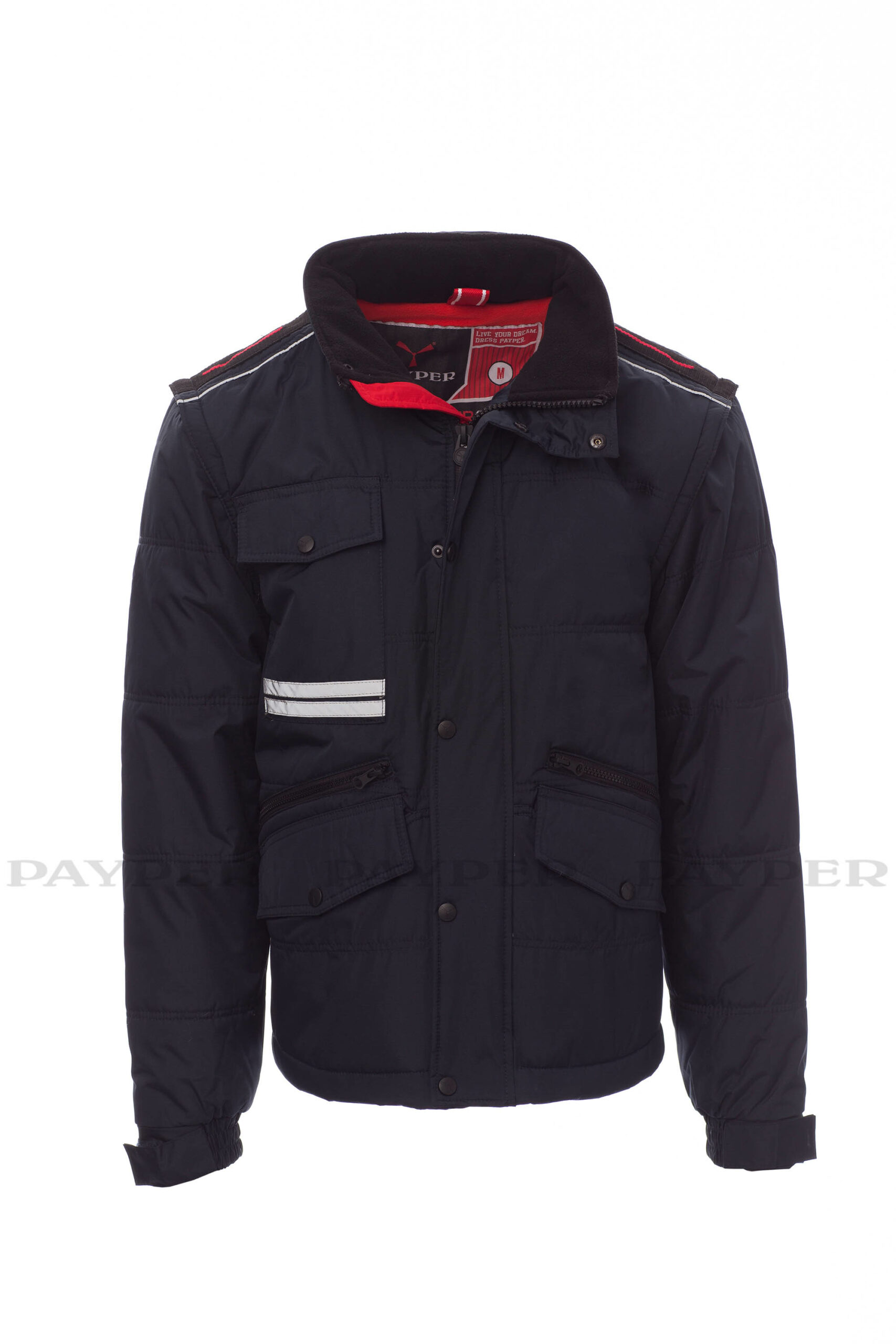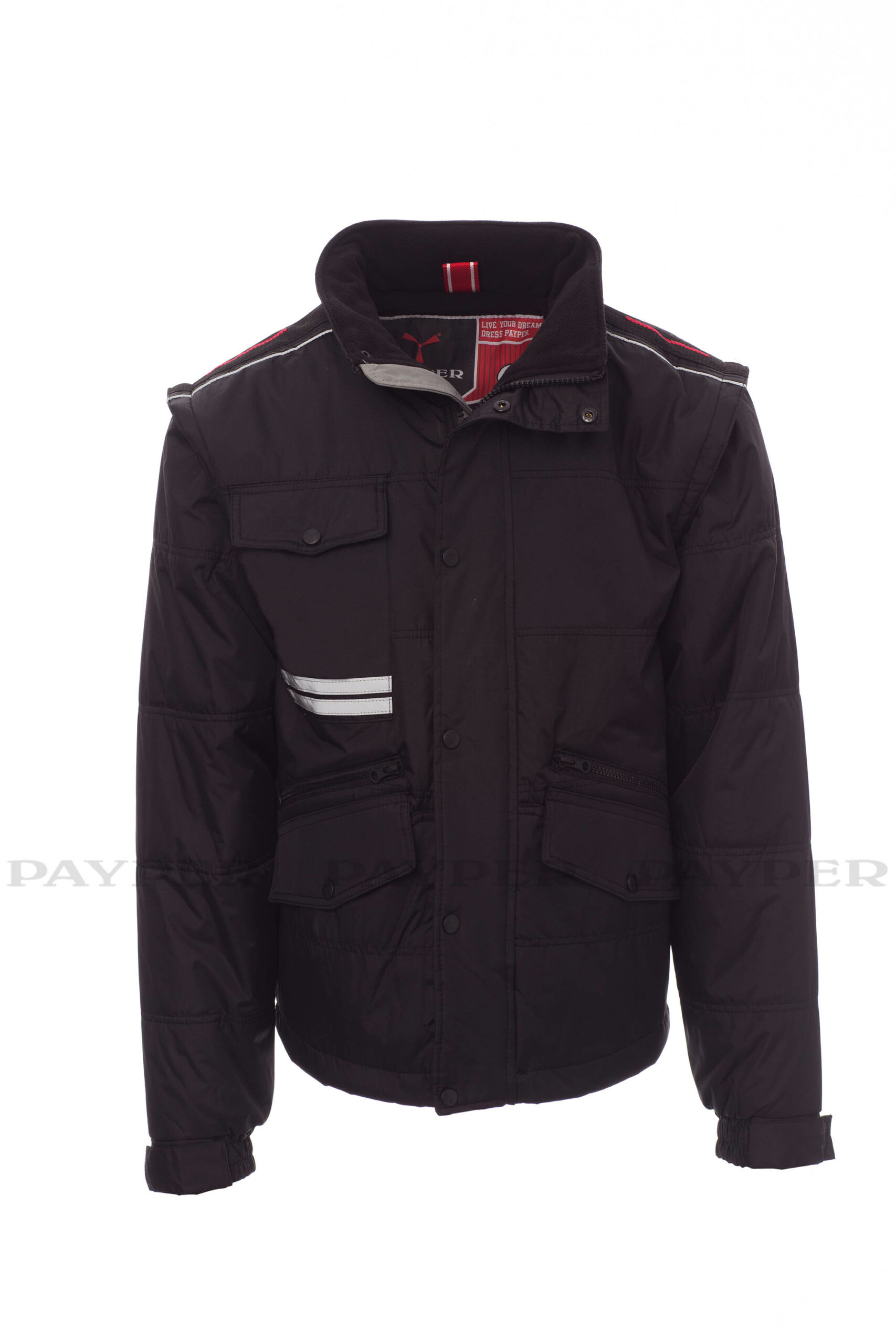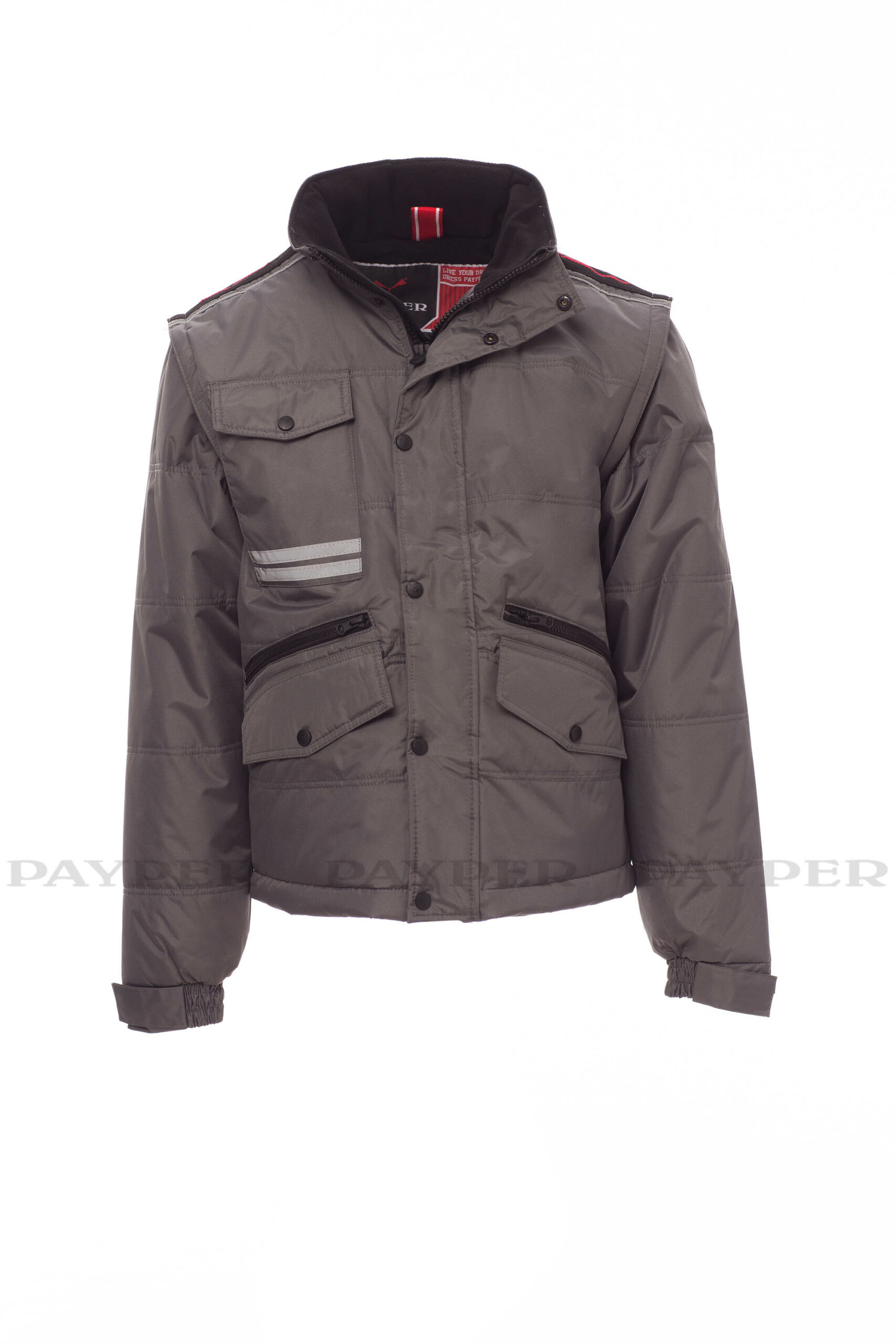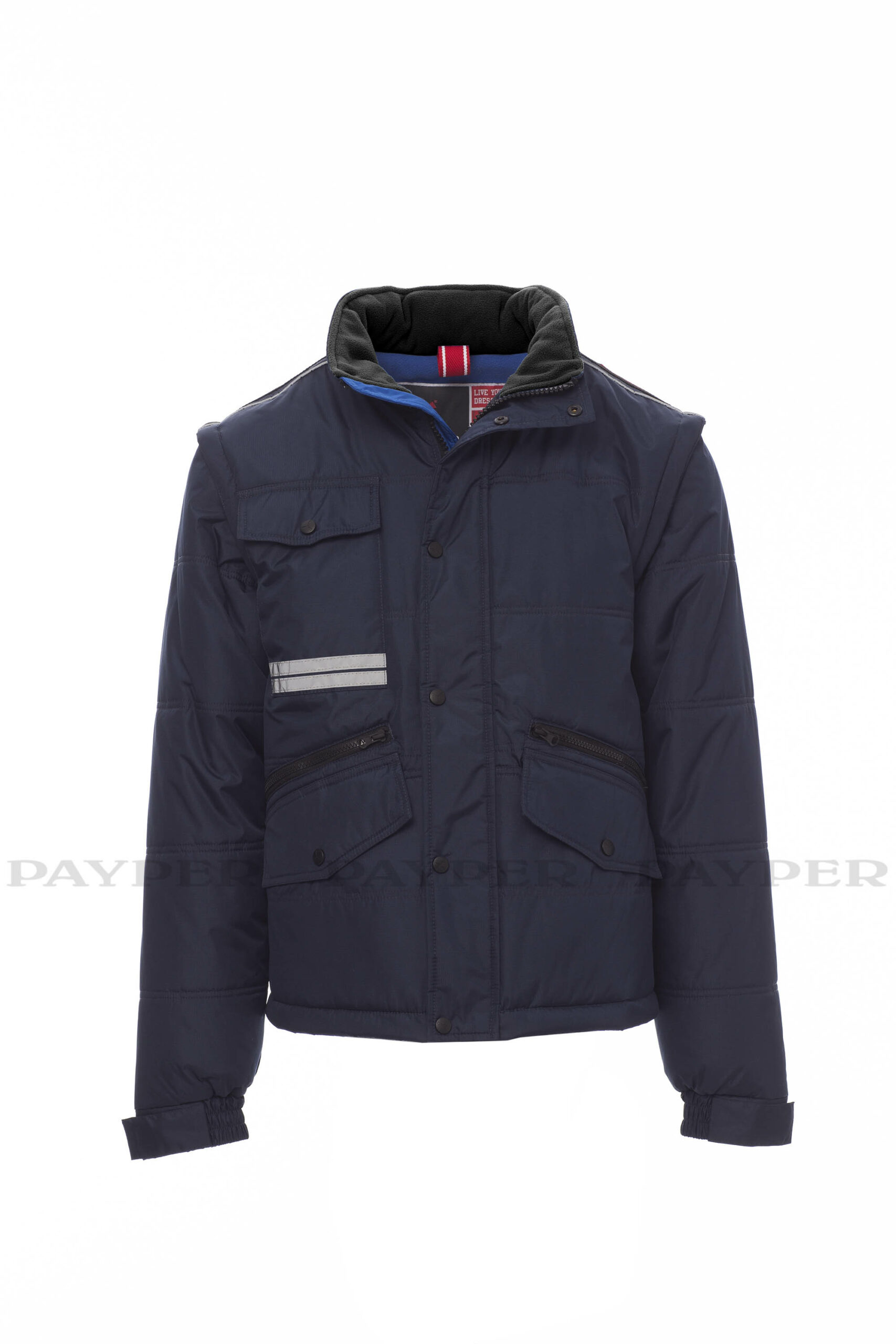 Giubbotto da uomo, maniche staccabili, zip 8 mm in plastica con cursore in metallo con patta e bottoni in plastica, retro sagomato e con cappuccio richiudibile nel colletto, due tasche esterne LOCK SYSTEM e due con zip, inclinazione delle tasche per agevolare l’ingresso della mano, una tasca al petto porta smartphone e anella porta badge, bande riflettenti sulla tasca e schiena. Interno: imbottito, pile in contrasto su schiena e collo, una tasca, zip interna per agevolare stampe e ricami.