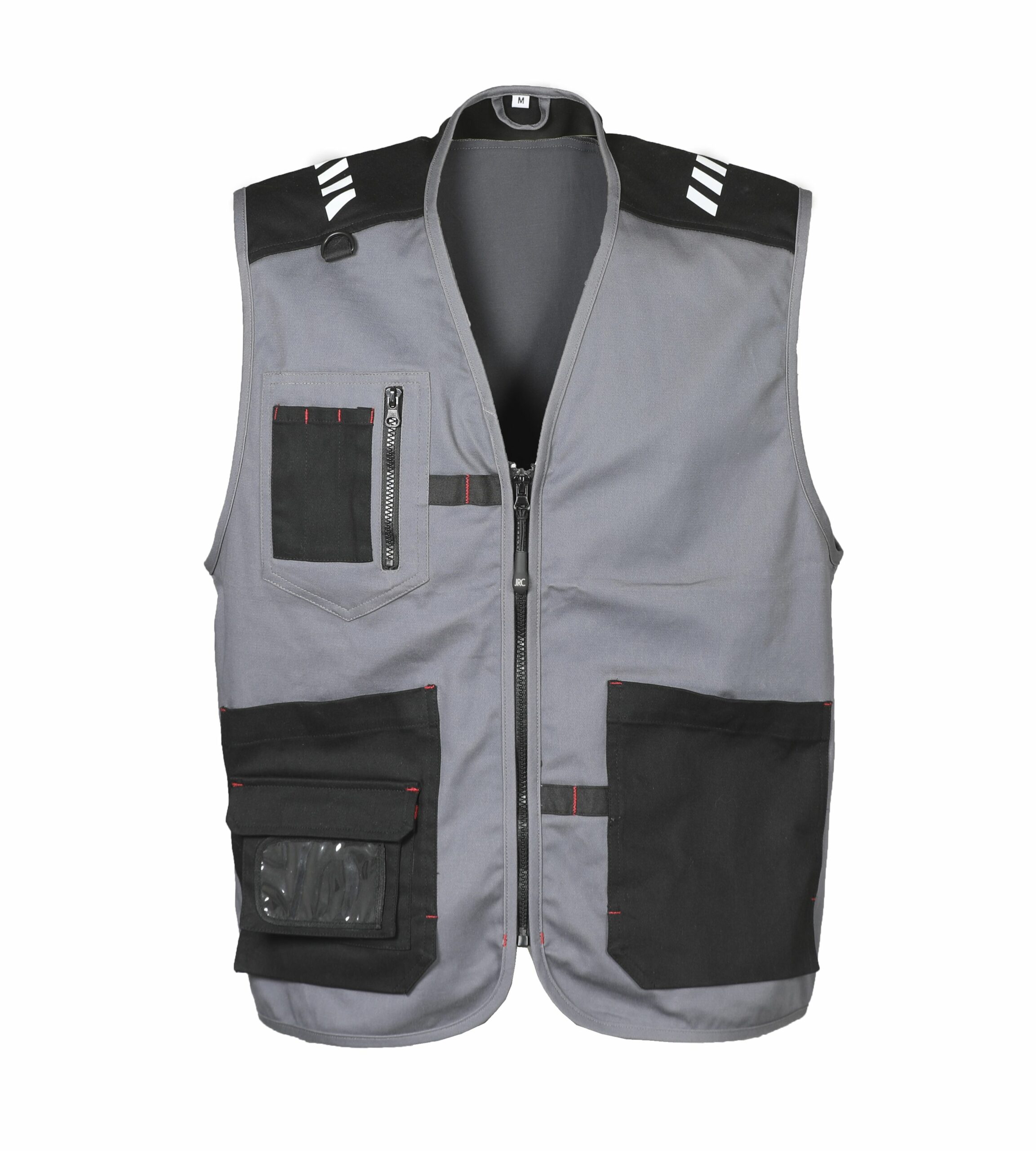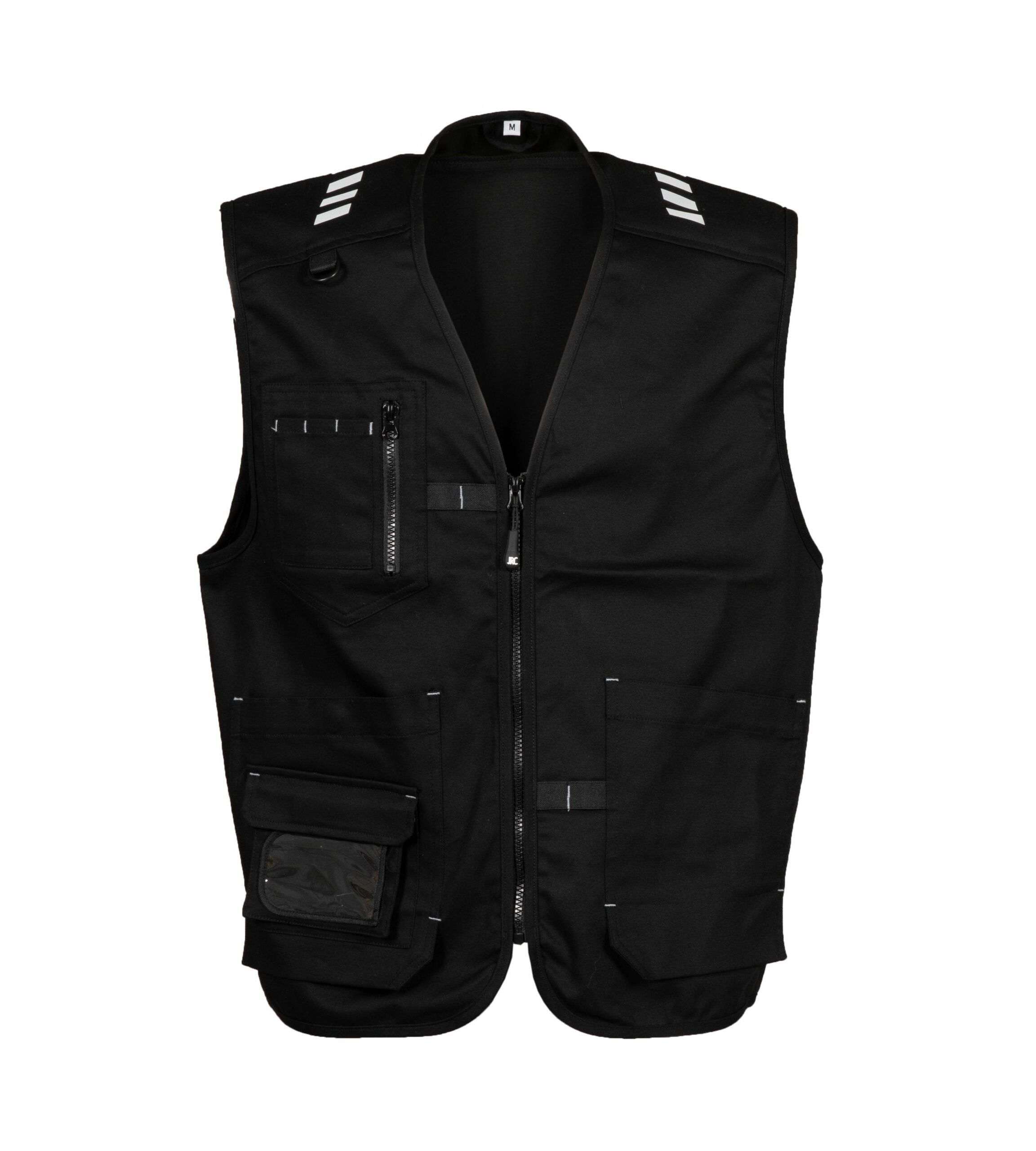 Gilet multitasche elasticizzato, non foderato, stampe rifrangenti sulle spalle, gancio portabadge o portachiavi, tasca sul petto con zip e triplo portapenna, due tasche in nylon 400 D antistrappo con bottoni automatici coperti, tasca con portabadge estraibile, passanti per utensili.