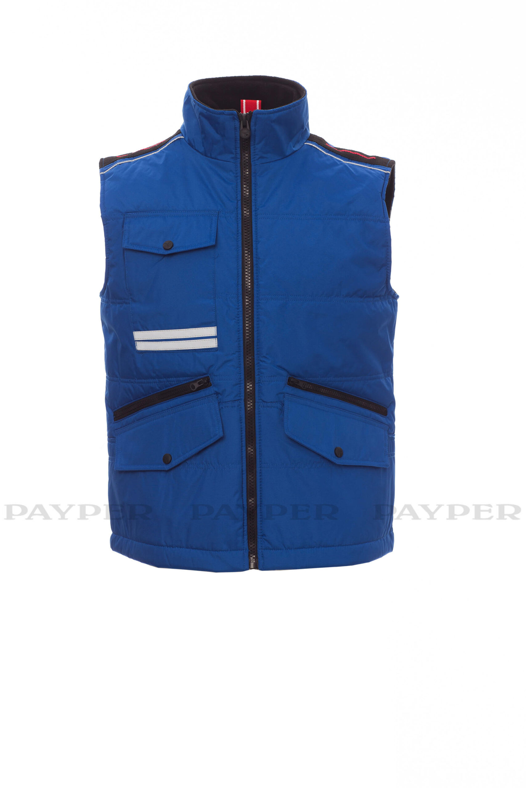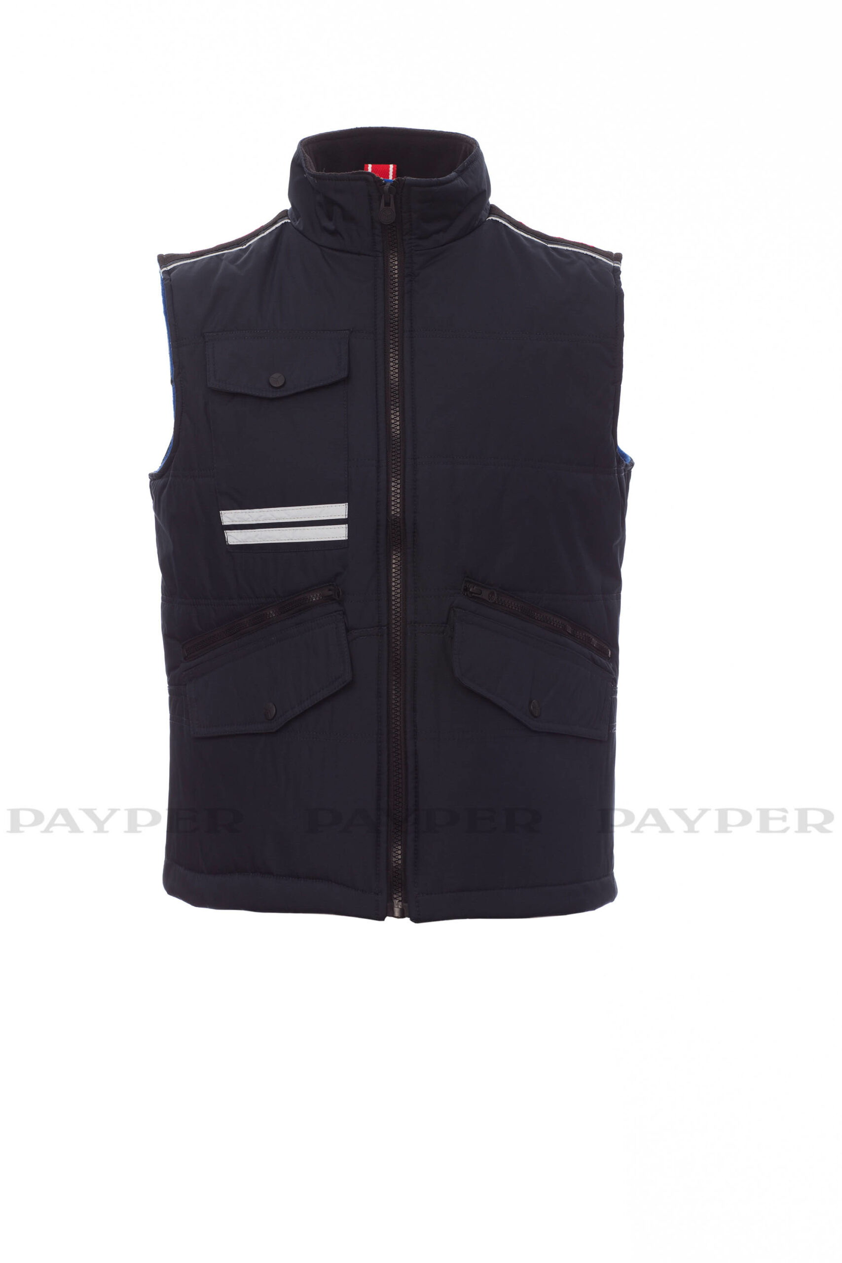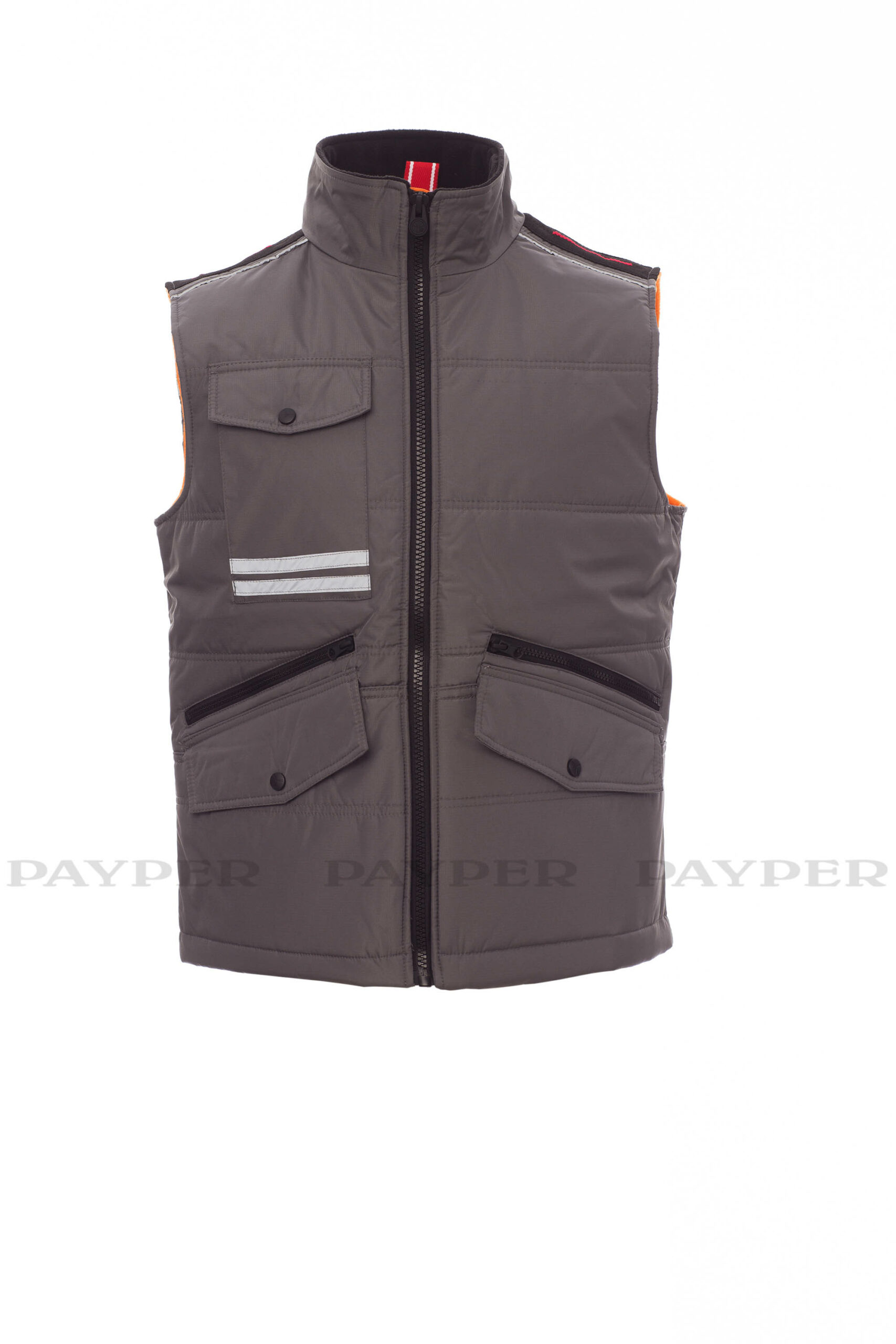 Gilet unisex, zip 8mm in plastica con cursore in metallo con patta e bottoni in plastica, retro sagomato, due tasche esterne LOCK SYSTEM e due con zip, inclinazione delle tasche per agevolare l’ingresso della mano, una tasca al petto porta smartphone e anella porta badge, bande riflettenti sulla tasca e schiena. Interno: imbottito, pile in contrasto su schiena e collo , una tasca, zip interna per agevolare stampe e ricami.