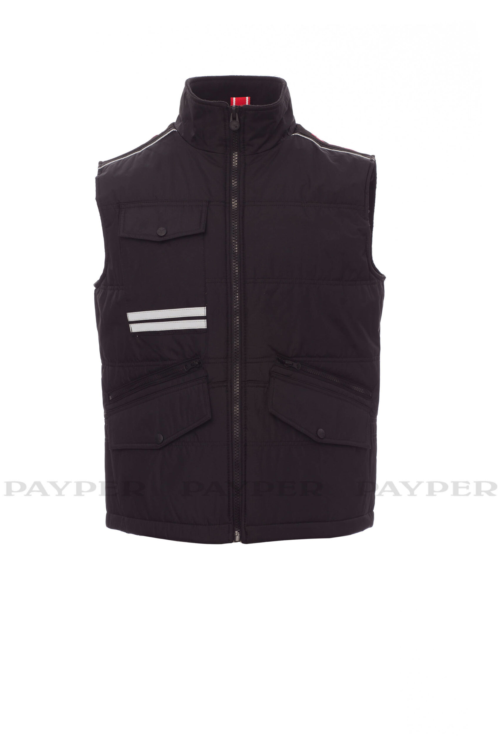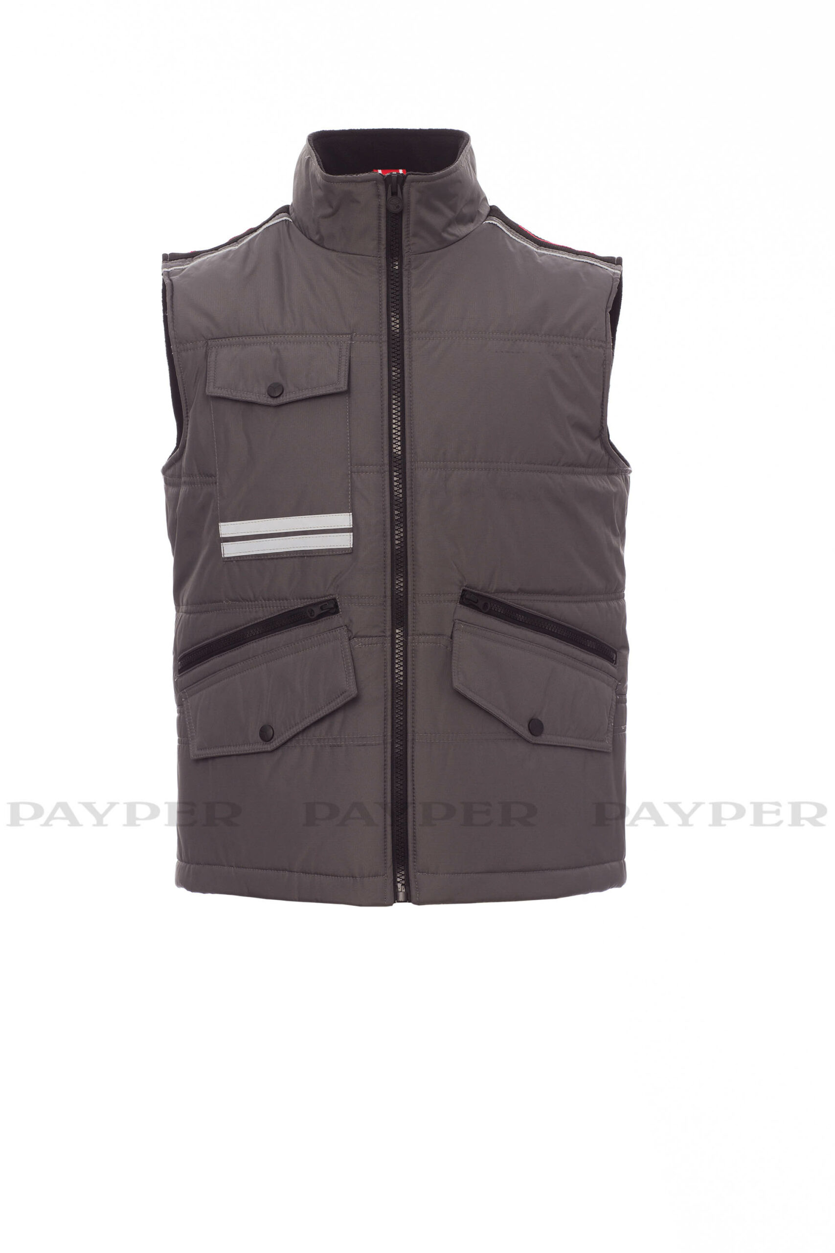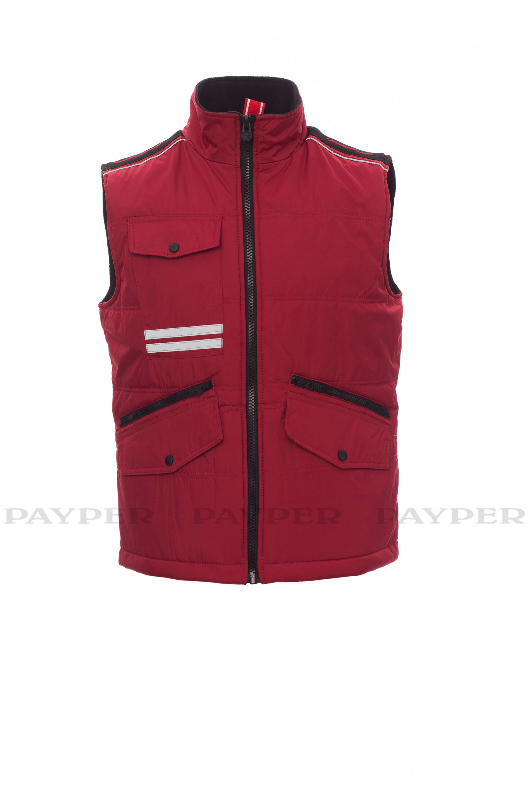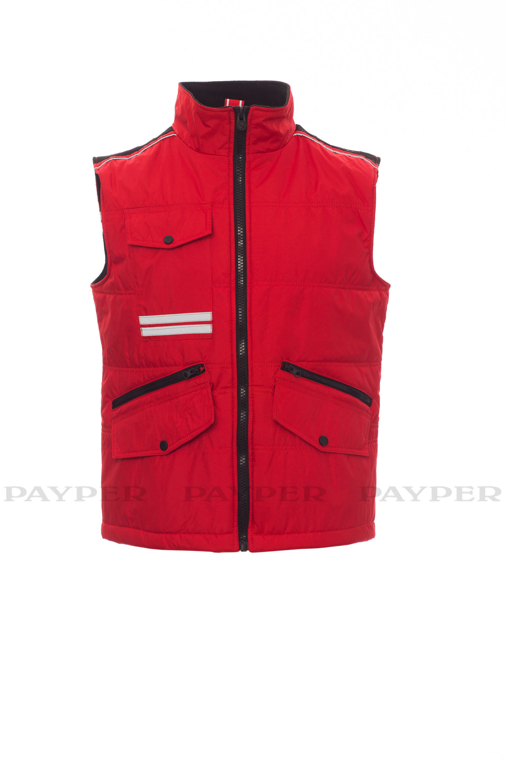Gilet unisex, zip 8mm in plastica con cursore in metallo con patta e bottoni in plastica, retro sagomato, due tasche esterne LOCK SYSTEM e due con zip, inclinazione delle tasche per agevolare l’ingresso della mano, una tasca al petto porta smartphone e anella porta badge, bande riflettenti sulla tasca e schiena. Interno: imbottito, pile in contrasto su schiena e collo , una tasca, zip interna per agevolare stampe e ricami.
