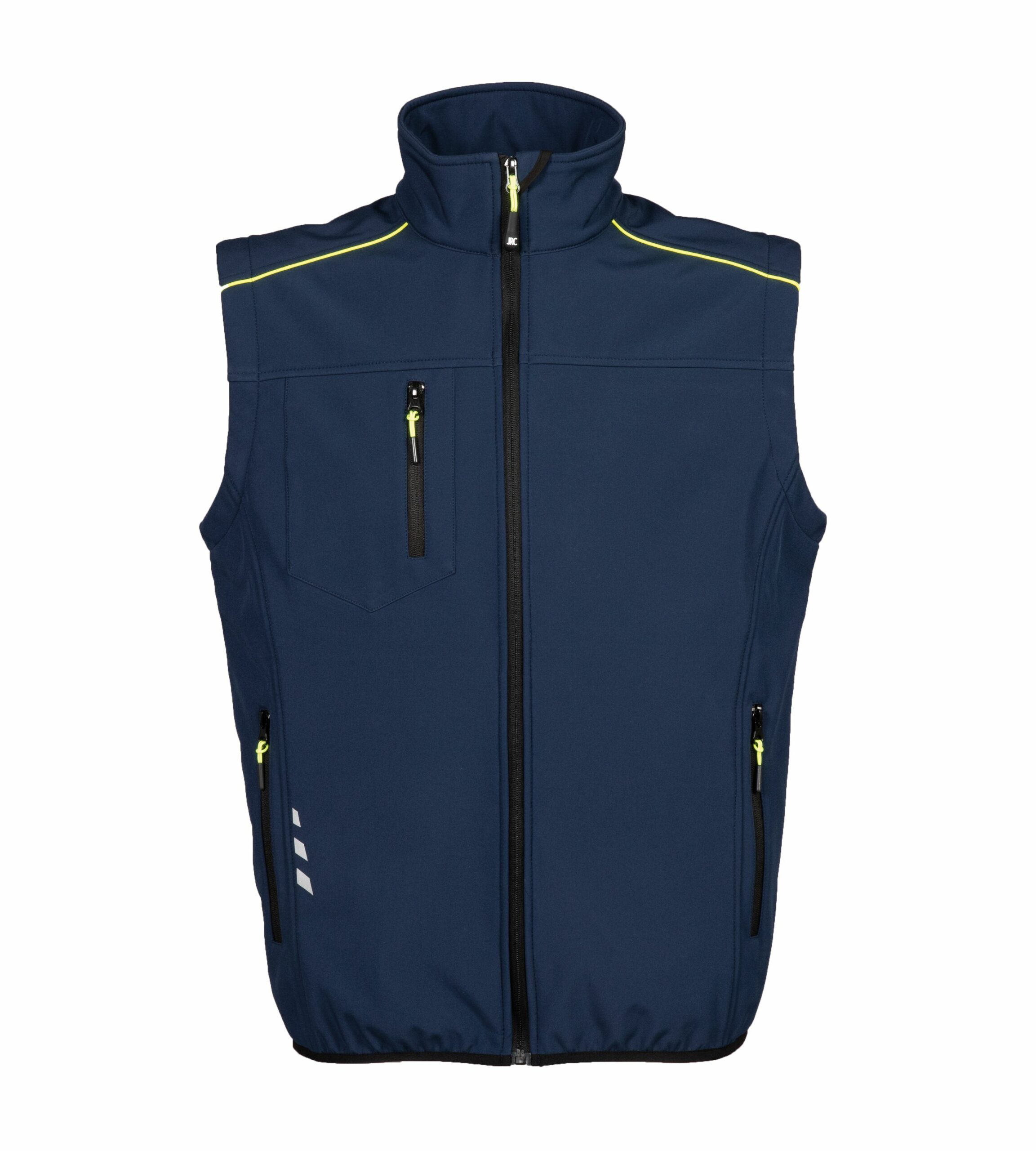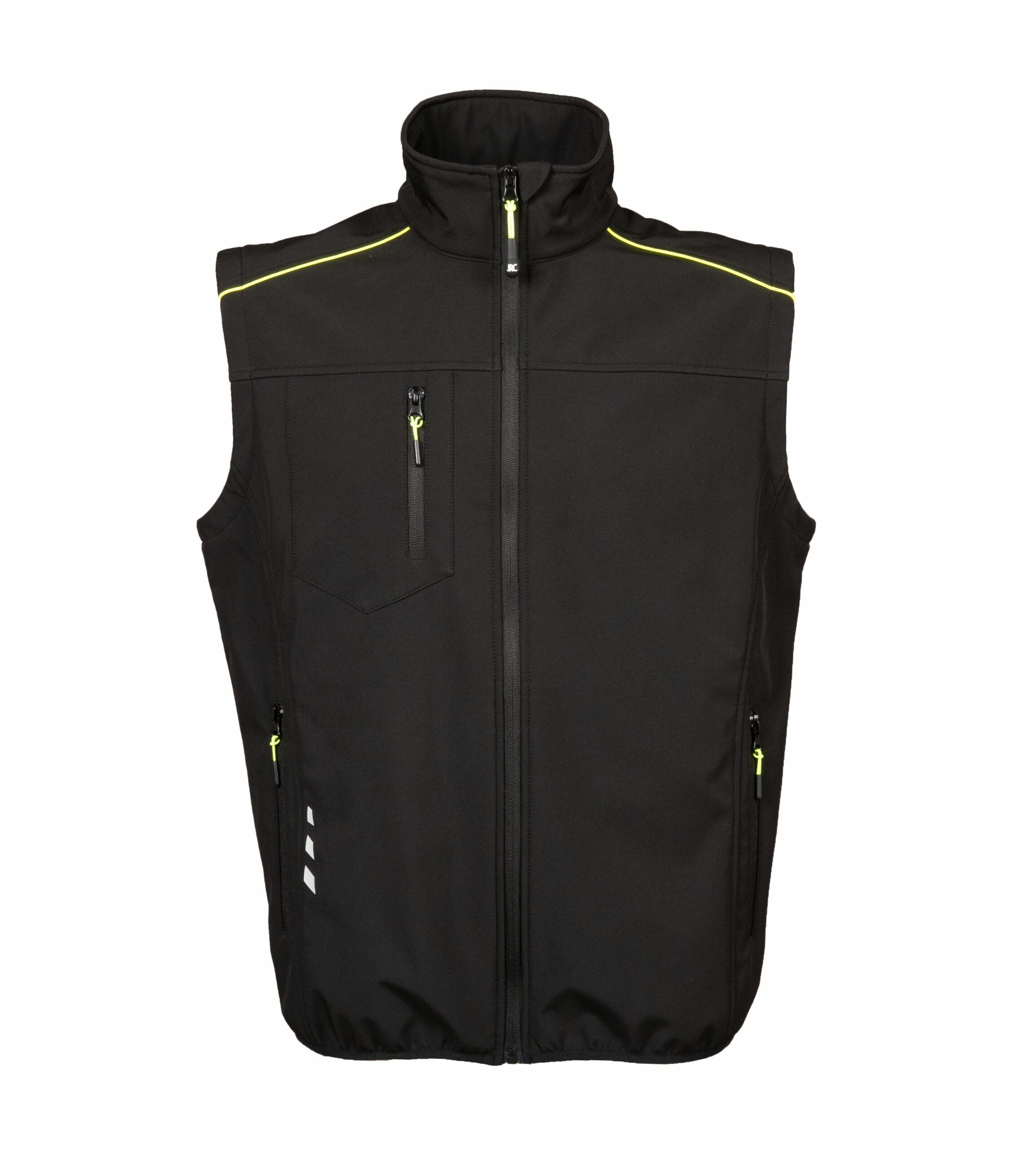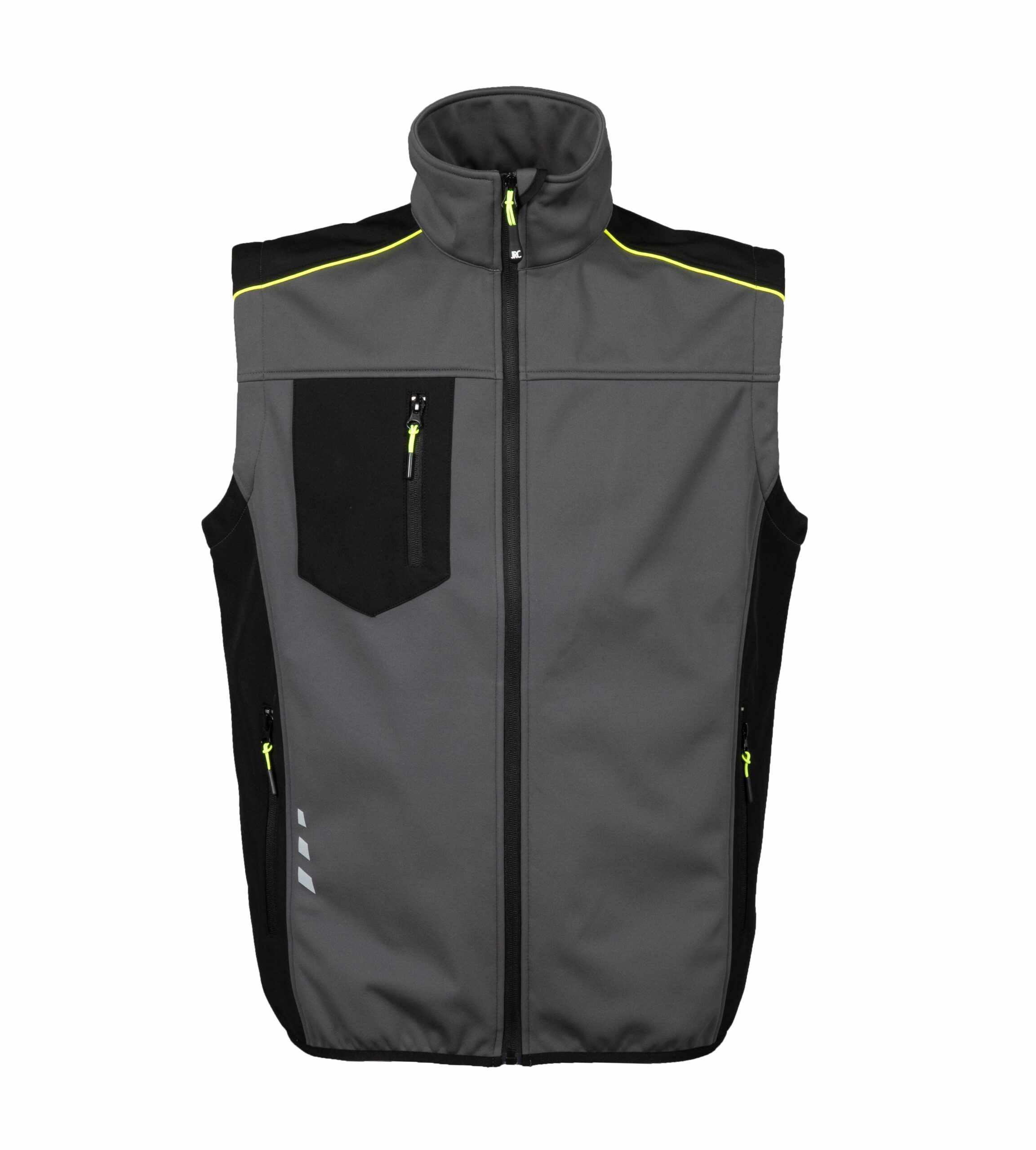 Gilet in soft shell a 3 strati impermeabile, impermeabilità 8000 mm/H2O, traspirabilità 1000 g/M2/24h, stampe rifrangenti anteriori e posteriori sul fianco, piping giallo fluo sulle spalle anteriori e sulla schiena, una tasca sul petto con zip, due tasche esterne con zip, tessuto a protezione del mento con