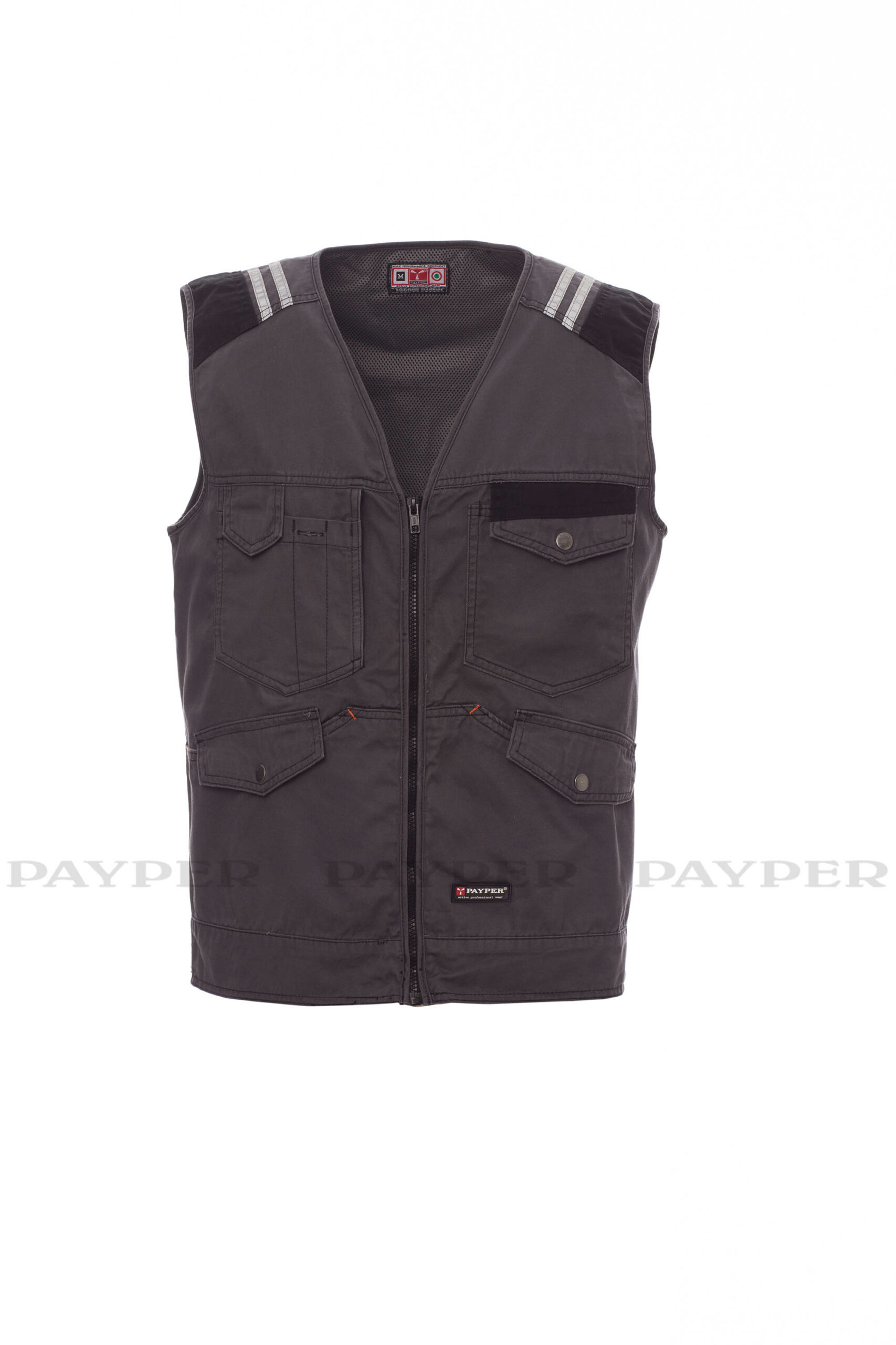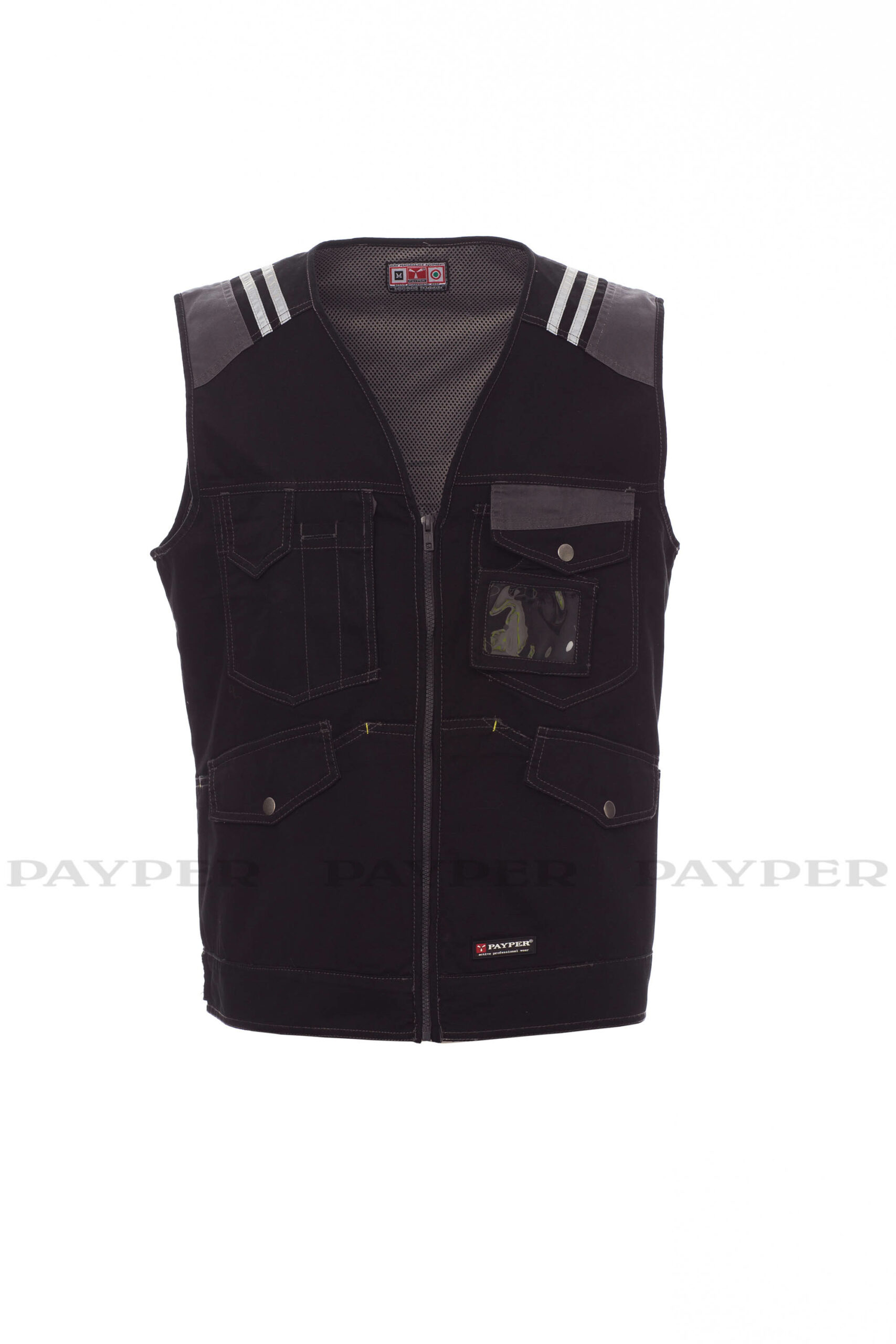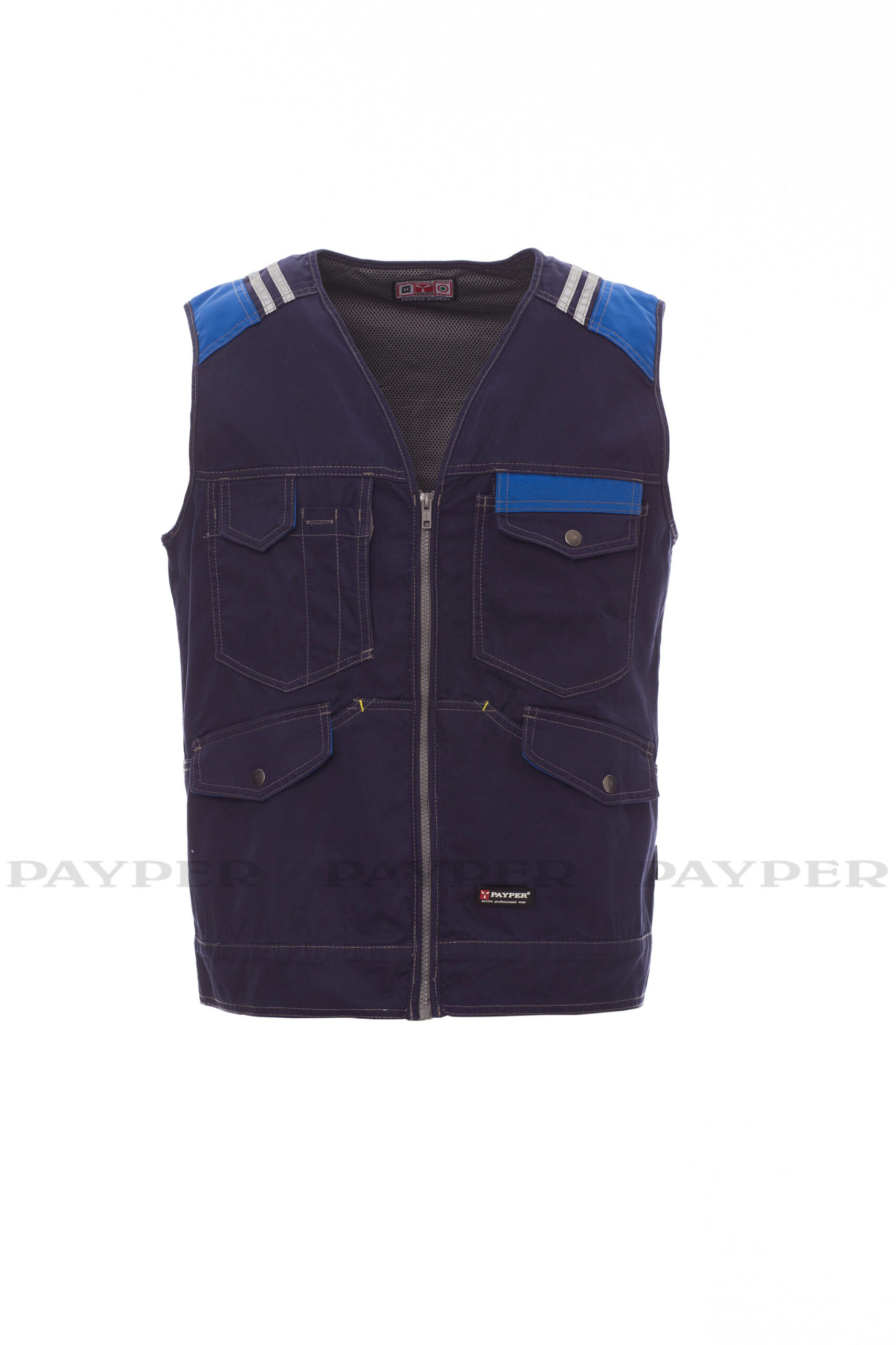 Gilet con inserti e impunture bicolore a contrasto, a taglio slanciato modello jeans, chiusura frontale con zip, due tasche frontali modello canguro con patta di chiusura LOCK SYSTEM e bottone in metallo, due tasche al petto di cui una LOCK SYSTEM, porta badge staccabile e richiudibile, portacellulare; piping riflettente sulla schiena; bande riflettenti alle spalle per maggior sicurezza e visibilità; fodera interna in dry-tech.