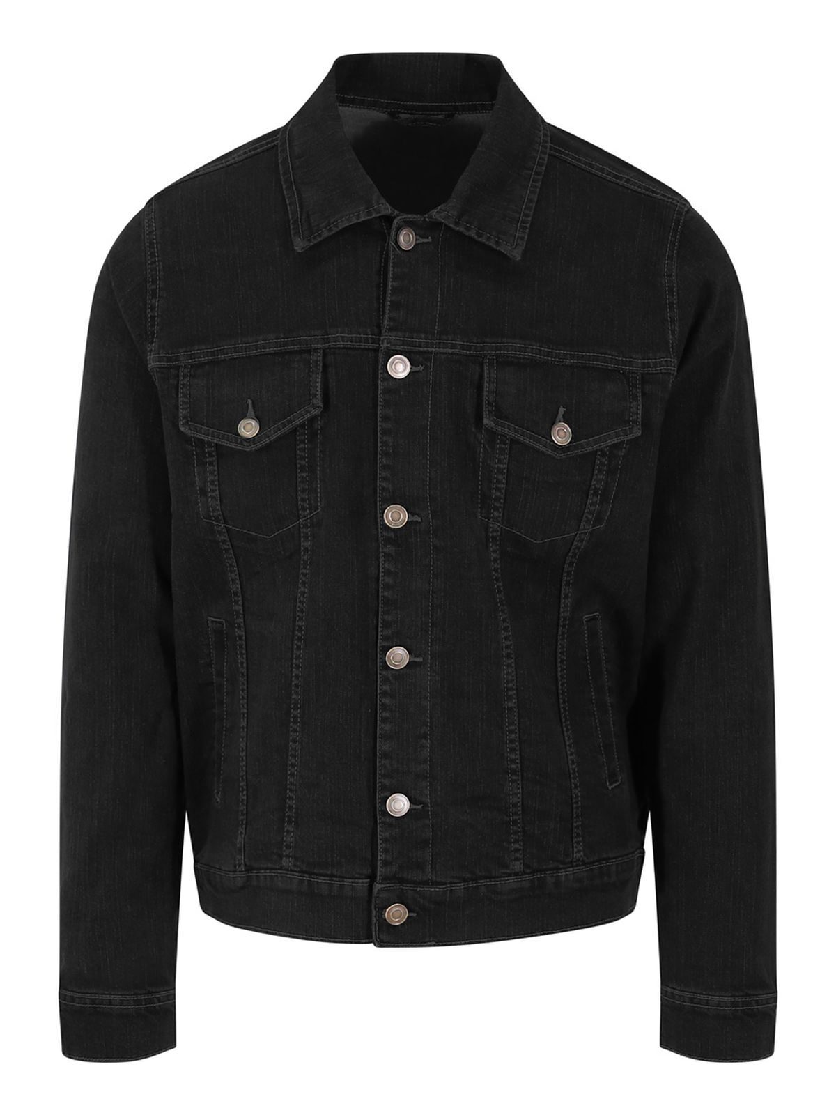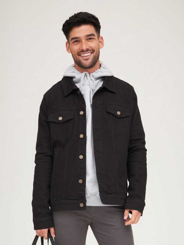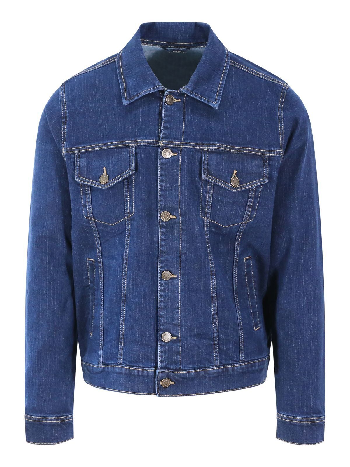 Giacca da uomo in denim elasticizzato, 4 tasche, lavaggi nei colori blu scuro e chiaro, cuciture a contrasto, chiusura con bottoni automatici, dettaglio polsino con bottoni, passante posteriore sul retro.