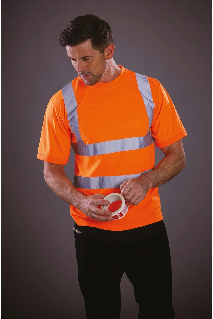 Due fasce riflettenti intorno al corpo e una su ogni spalla. Tessuto morbido al tatto. Finitura a doppia impuntura. Tessuto morbido. Colletto e polsini a costine morbidi tono su tono. Due fasce riflettenti larghe 5 cm attorno al corpo e una su ogni spalla. Confezione singola. Conforme alla norma EN ISO20471:2013 Classe 2 : Hi-Vis Orange & Hi-Vis Yellow. HI-Vis Orange sempre conforme alla norma Go/RT 3279.