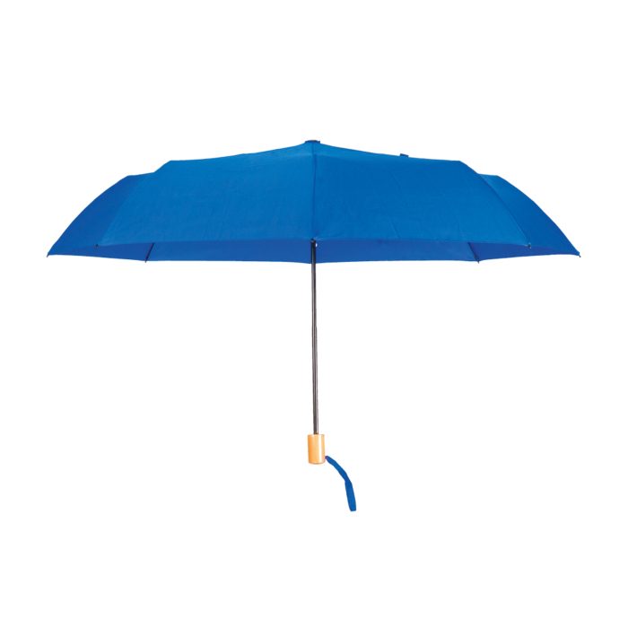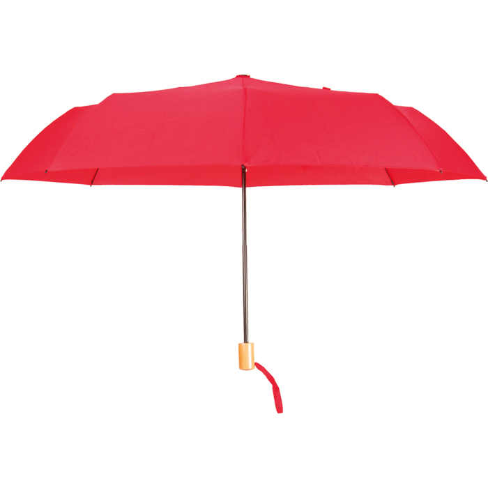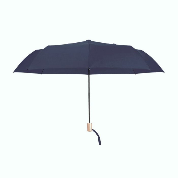 Tessuto realizzato dal riciclo delle bottiglie in PET (RPET), richiudibile, con manico in legno e laccio per trasporto, asta in metallo, raggi in metallo e fibra di vetro, fodera in pongee RPET, apertura manuale.