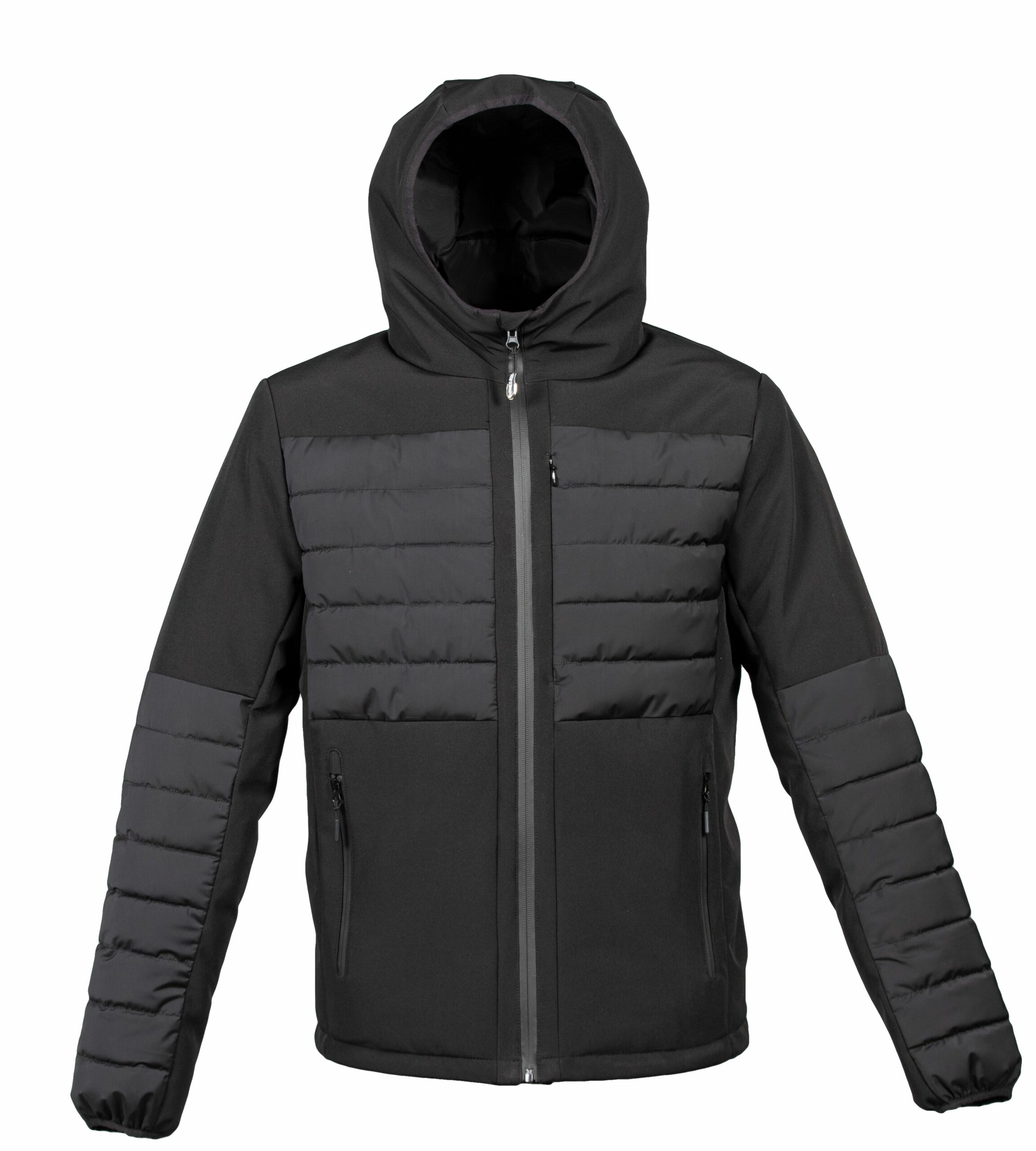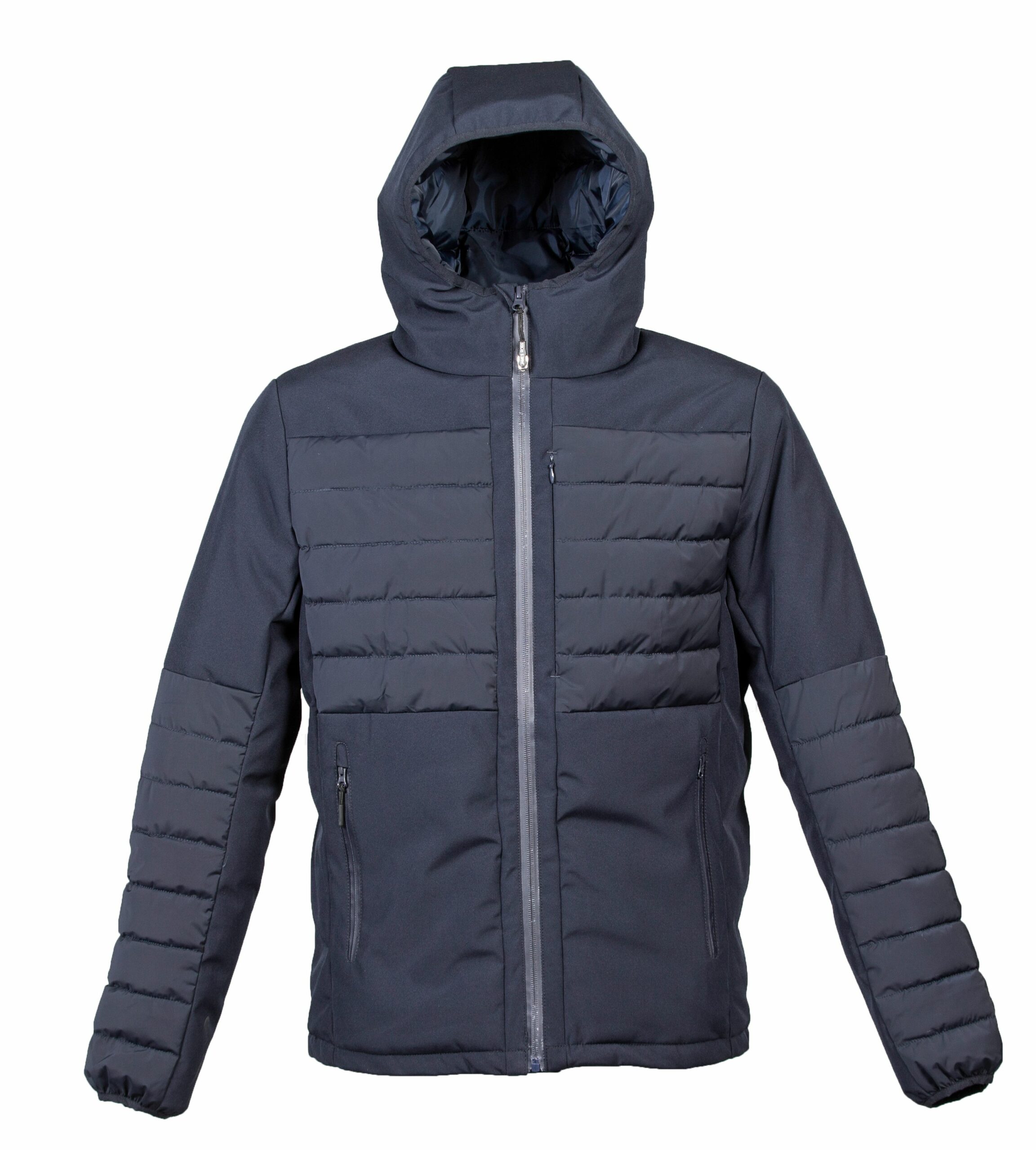 Giubbino in tessuto composito impermeabile con membrana TPU, fodera in morbido poliestere, traspirabilità, imbottitura in soft poliestere, cappuccio imbottito con finitura in tessuto elasticizzato, cerniere antiacqua con taglio laser una tasca esterna sul petto con zip invisibile, due ampie tasche esterne con zip, una tasca interna portafoglio con zip, tessuto interno a protezione del mento, tessuto elasticizzato ai polsi
