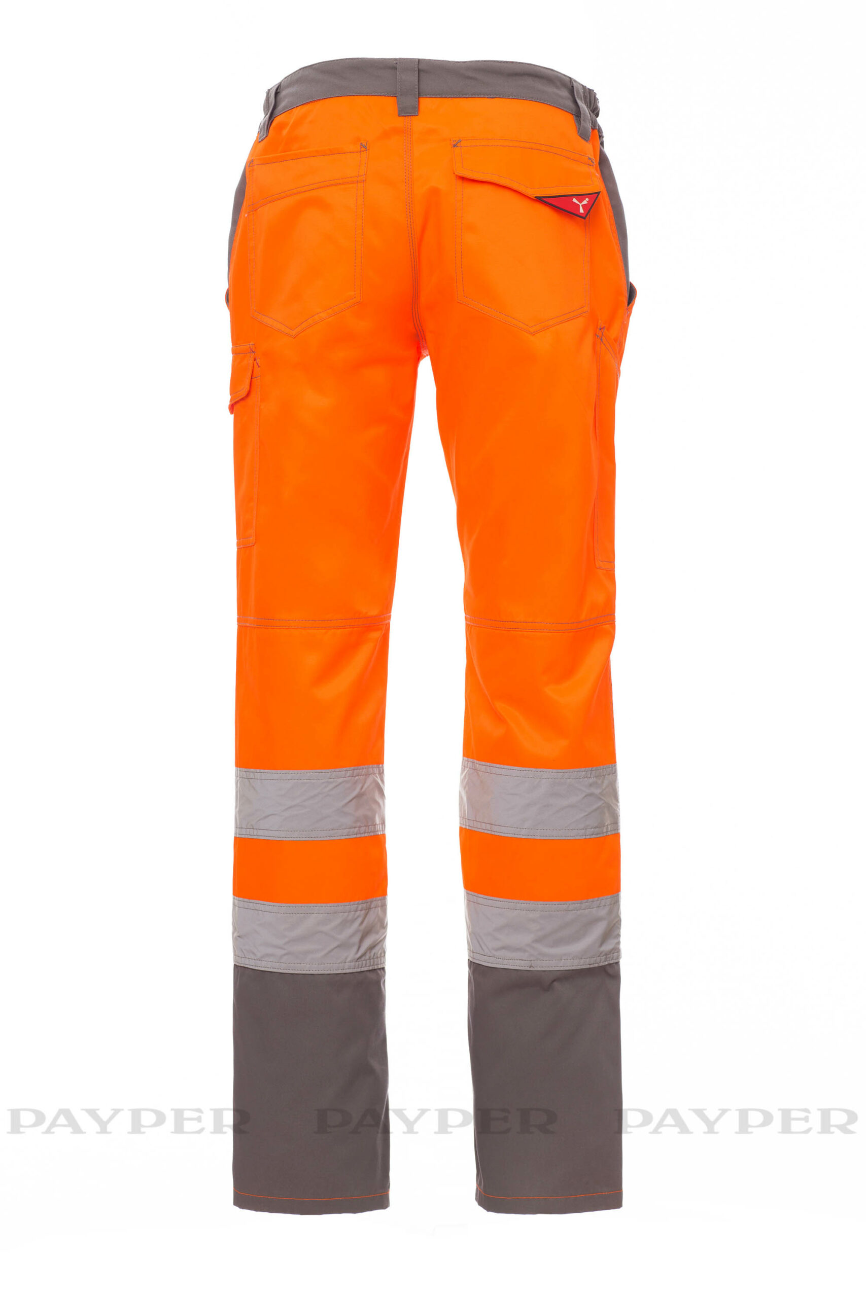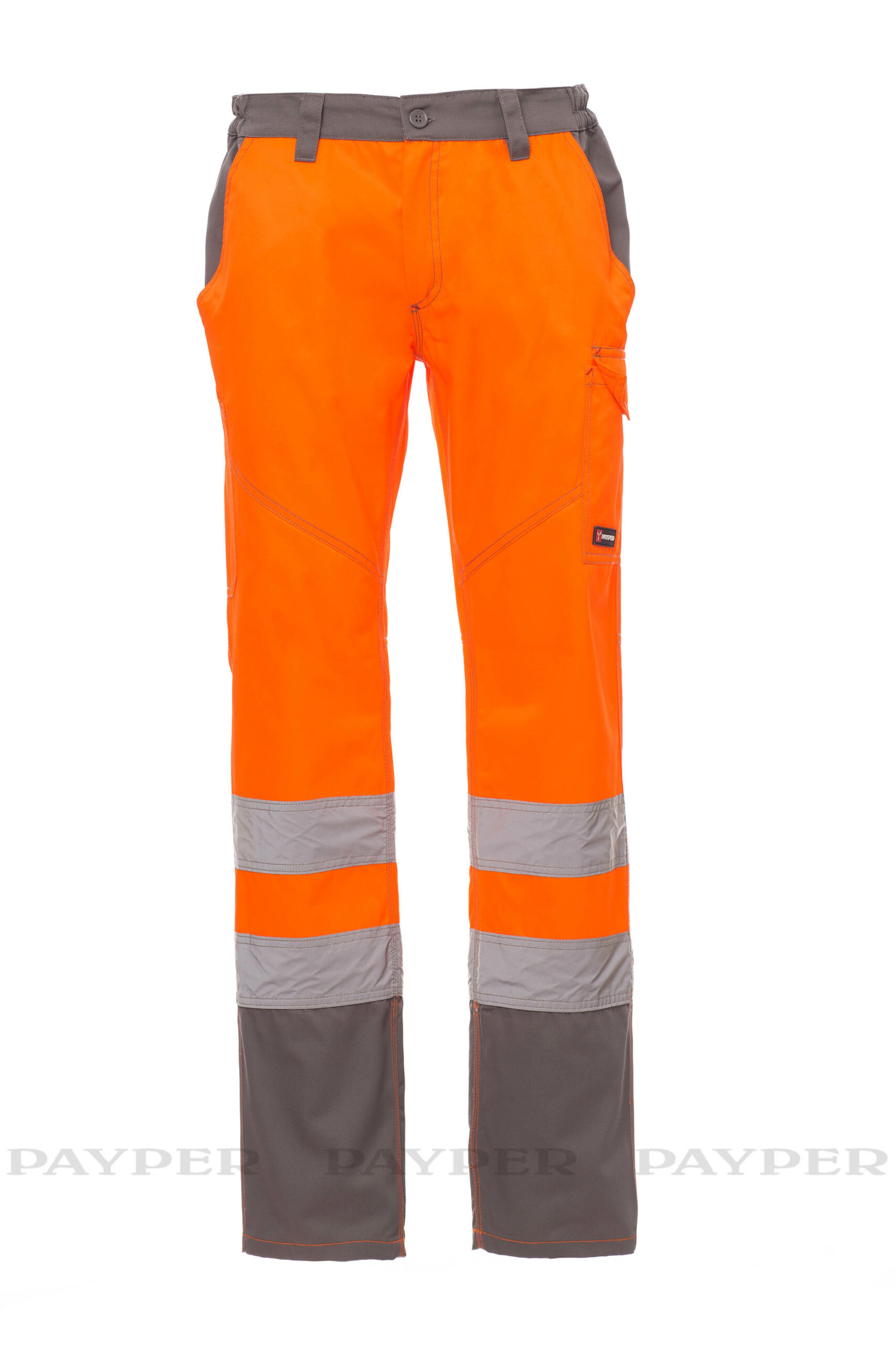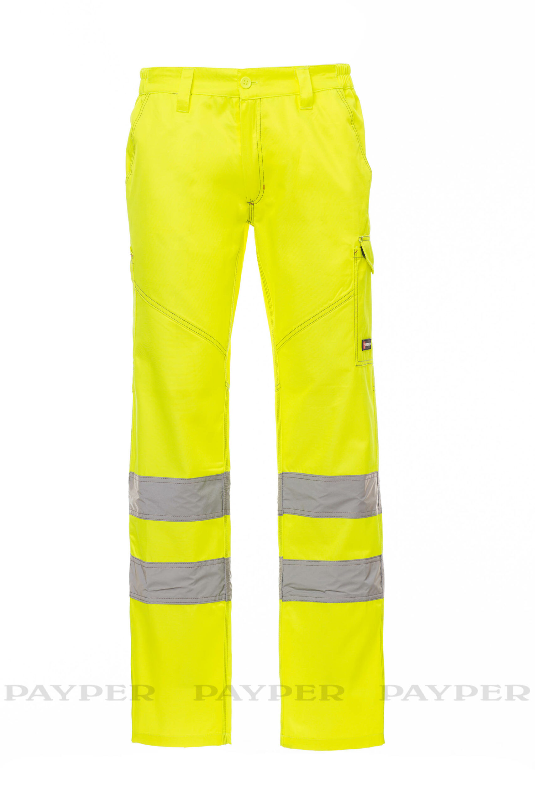 Pantalone uomo, multistagione, in alta visibilità con bande riflettenti, elastici laterali e passanti in vita, chiusura con zip e bottone in plastica, due tasche anteriori a taglio classico, tasca laterale LOCK SYSTEM, porta metro, due tasche posteriori una aperta e una con patta e velcro. Cuciture a contrasto, cavallo e interno gamba a triplo ago.