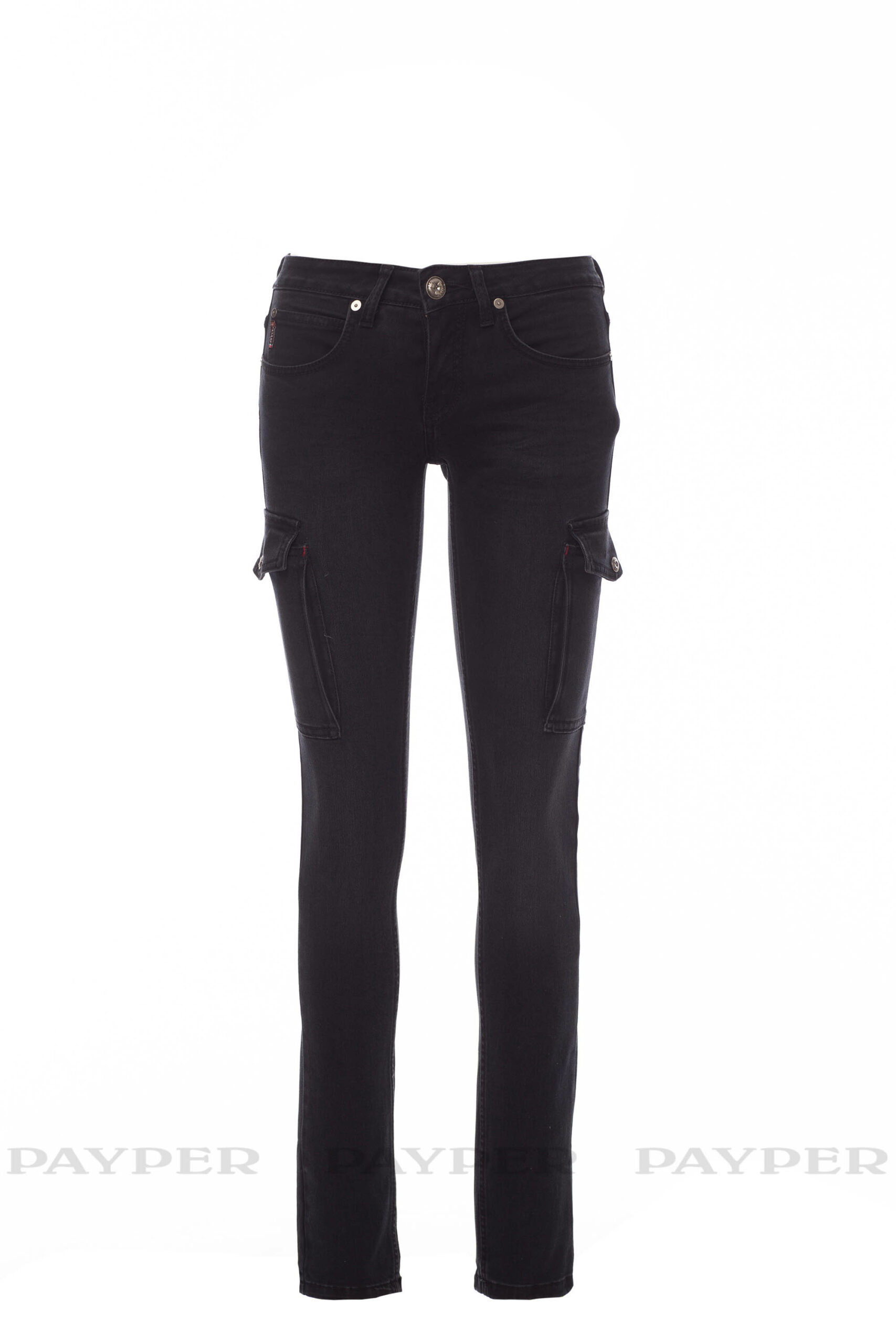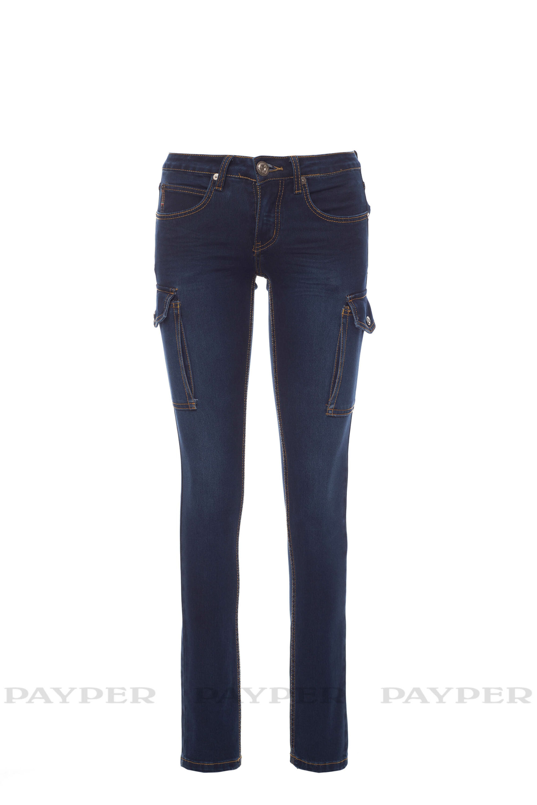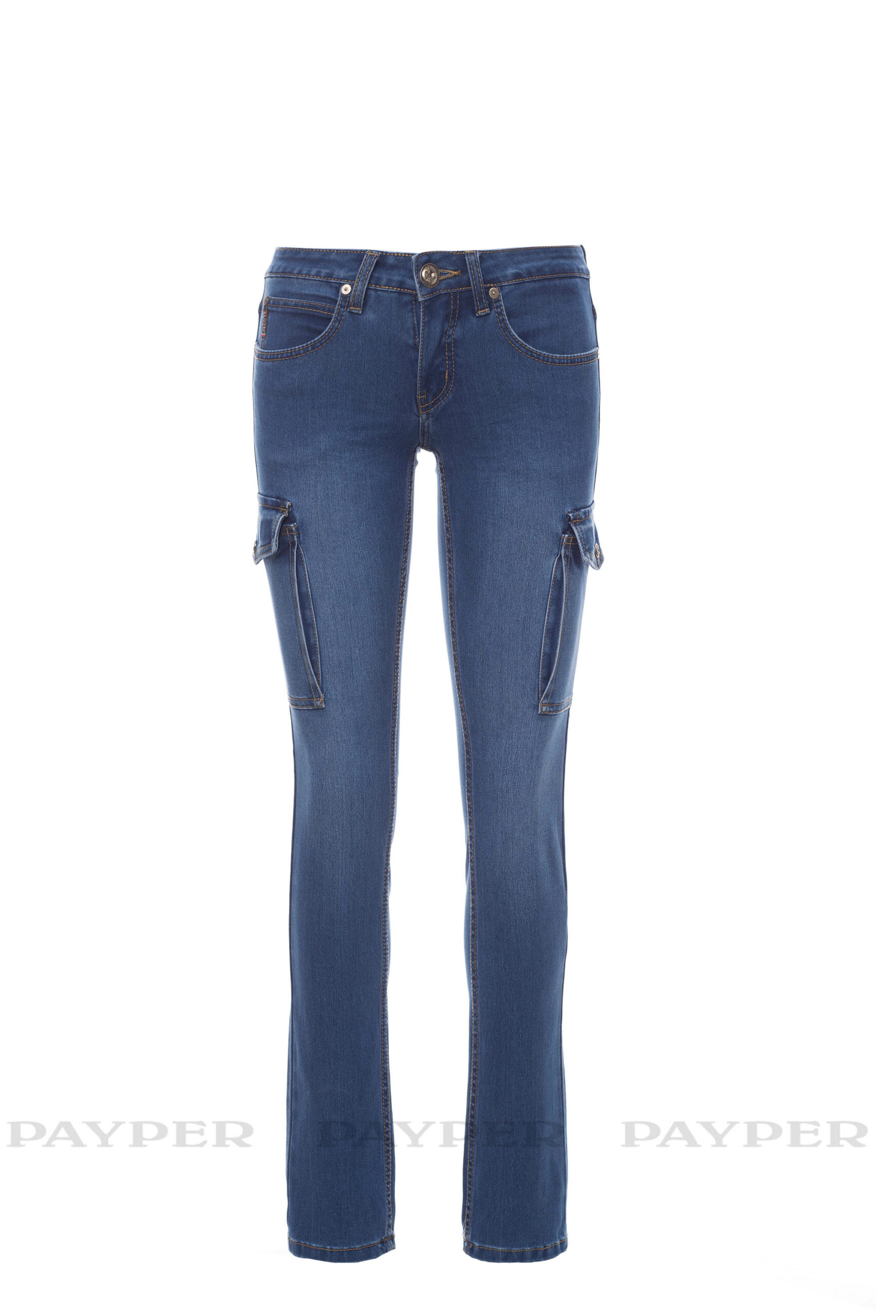 Pantalone donna, taglio jeans a cinque tasche, due tasche laterali LOCK SYSTEM con leggero soffietto, chiusura con zip in metallo e bottone, passanti in vita, stone wash, effetto consumato e delavé. Cuciture a filo grosso a contrasto, doppie cuciture interno gamba, gamba a tubo, borchiette e patch in vera pelle. Peso del tessuto: 12oz/yd².