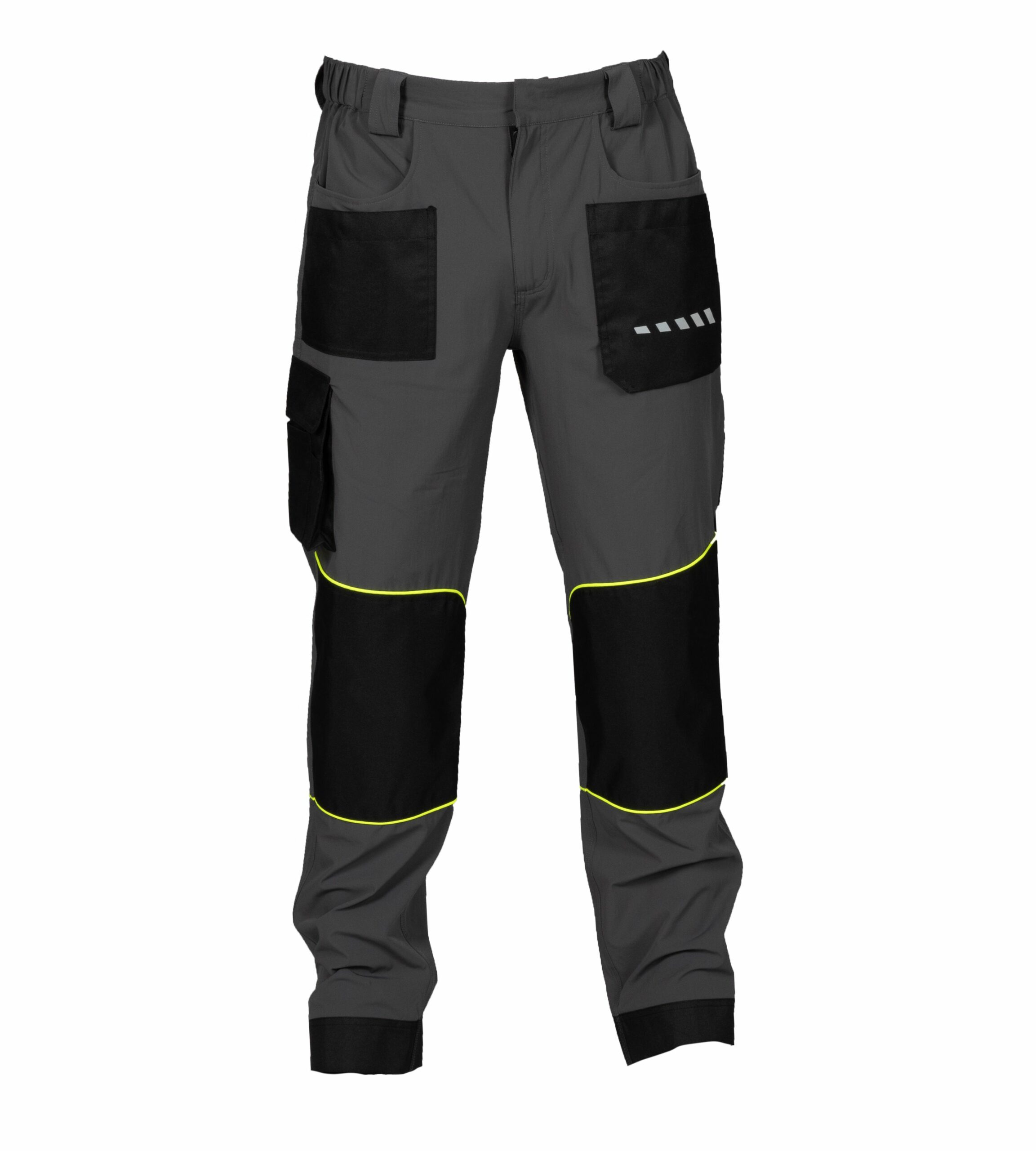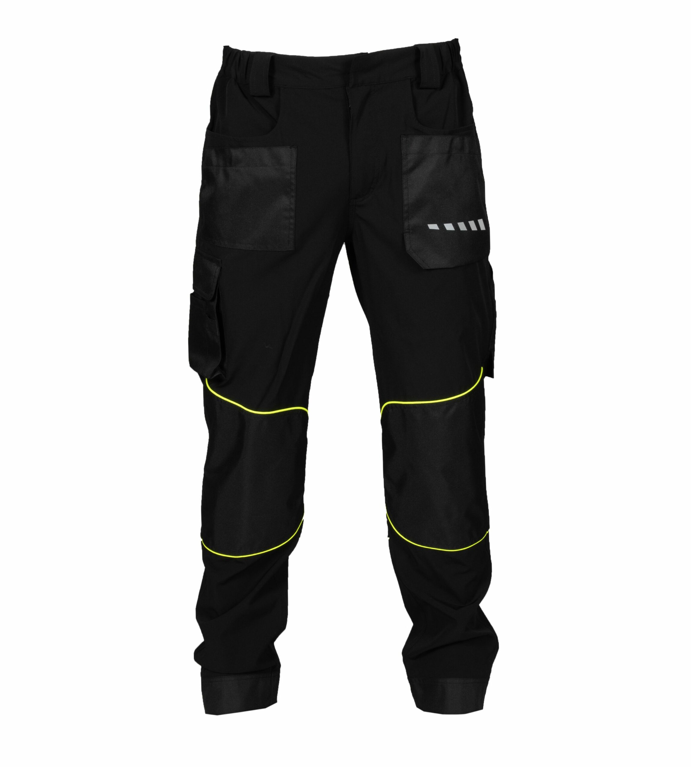 Pantalone in tessuto 4 stretch elasticizzato in orrizonatle e verticale per il massimo comfort, tessuto principale, tessuto di rinforzo color nero, in nylon 400D antistrappo, stampe rifrangenti anteriori e posteriori, due tasche anteriori, due tasche applicate in tessuto antistrappo con bottoni automatici coperti, una tasca laterale in tessuto antistrappo con gancio estraibile portachiave o portabadge; doppio portapenne e passante porta utensile, doppia tasca posteriore portametro e portautensili, in tessuto antistrappo e logo 4STRETCH, due tasche posteriori con velcro, in tessuto antistrappo, tessuto antistrappo sulle ginocchia con piping giallo fluo, tessuto antistrappo allungabile al fondo gamba, piping giallo fluo sulla tasca laterale e posteriore, elastici in vita e passanti maggiorati, bottone automatico in vita coperto, triple cuciture, nessun elemento graffiante, no label.