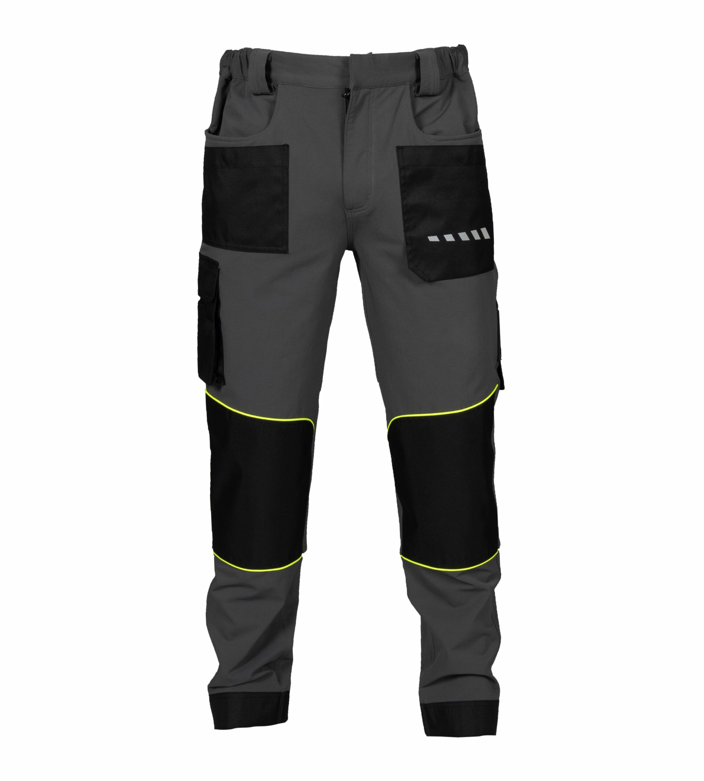Pantalone in tessuto 4 stretching elasticizzato in orrizzontale e verticale per garantire il massimo comfort, tessuto principale, tessuto di rinforzo color nero, in nylon 400D antistrappo, stampe rifrangenti anteriori e posteriori, due tasche anteriori, due tasche applicate in tessuto antistrappo con bottoni automatici coperti, una tasca laterale in tessuto antistrappo con gancio estraibile portachiave o portabadge; doppio portapenne e passante porta utensile, doppia tasca posteriore portametro e portautensili in tessuto antistrappo e logo 4STRETCH, due tasche posteriori con velcro, in tessuto antistrappo, tessuto antistrappo sulle ginocchia con piping giallo fluo, tessuto antistrappo allungabile al fondo gamba, piping giallo fluo sulla tasca laterale e posteriore, elastici in vita e passanti maggiorati, bottone automatico in vita coperto, triple cuciture, nessun elemento graffiante, no label.