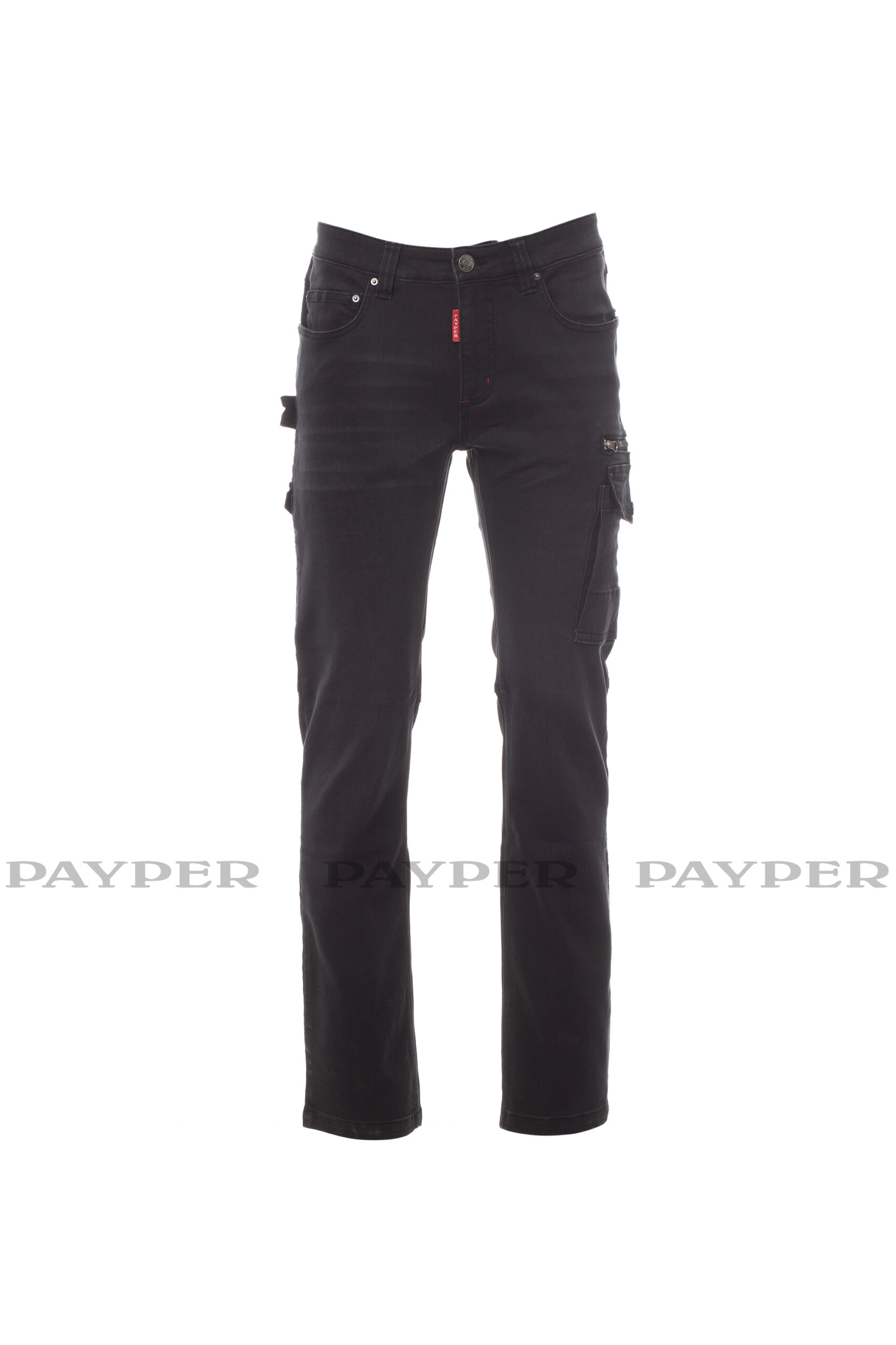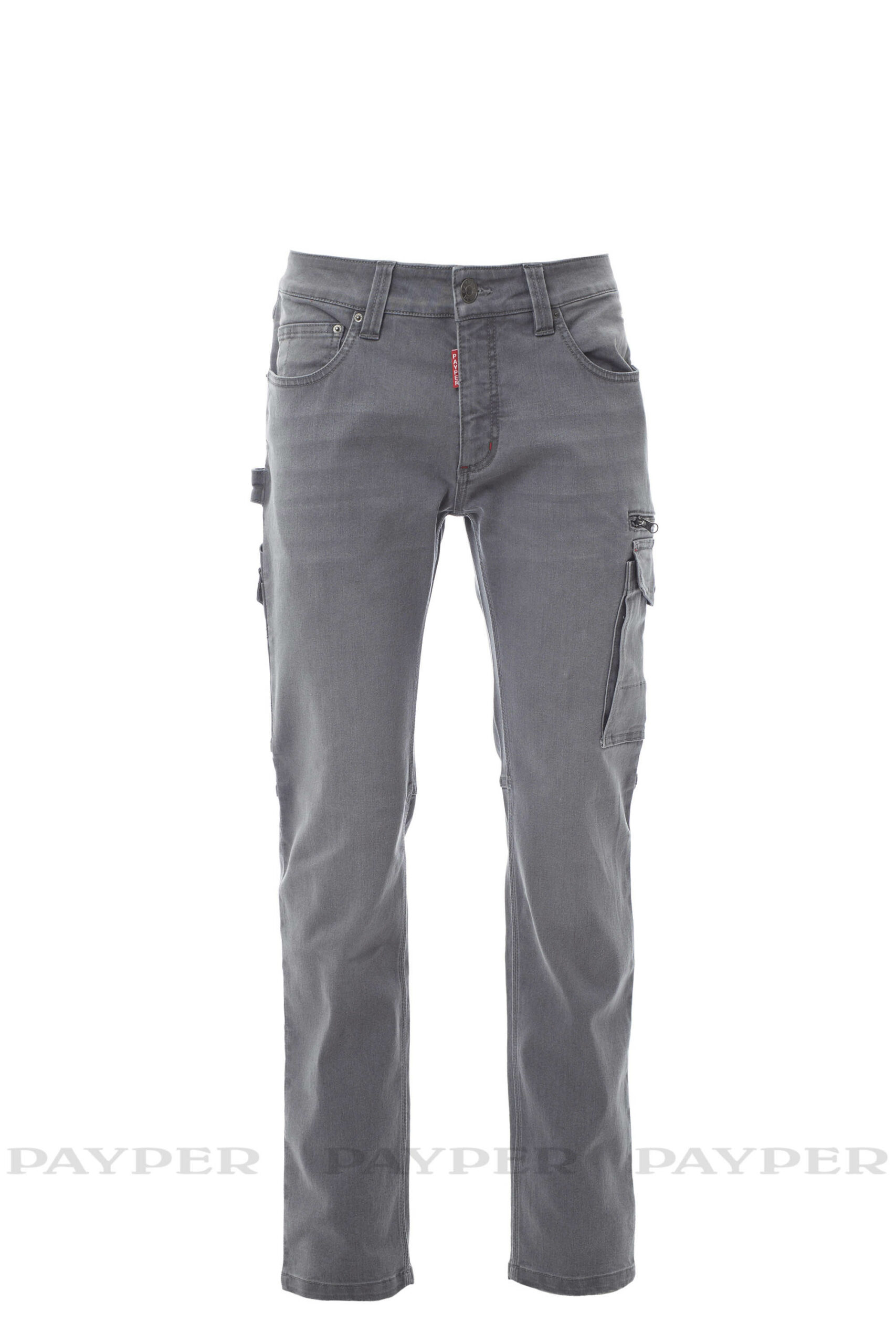 Pantalone multitasche uomo, taglio jeans a cinque tasche, chiusura con zip in metallo e bottone, passanti in vita, 1 tascone laterale LOCK SYSTEM con rinforzo interno, 1 tasca con zip, 1 porta metro, 1 porta smartphone, 1 porta martello, 1 taschino porta penne e cutter, trattamento stone wash effetto consumato e délavé. Gamba a tubo, cuciture filo grosso a contrasto ed a triplo ago interno gamba. Peso del tessuto: 10,50oz/yd².