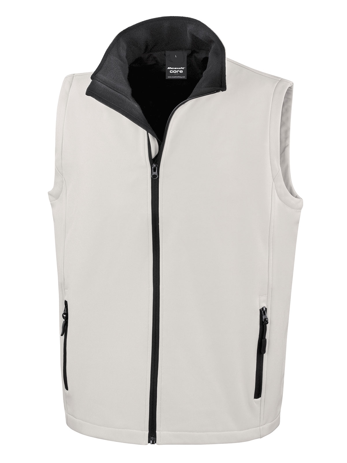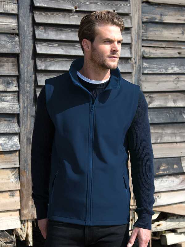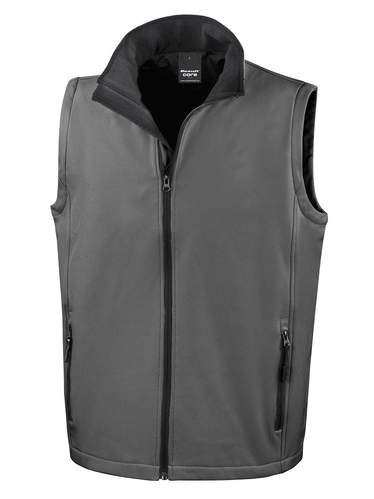 Giacca smanicata in softshell a due strati, con interno in micropile, antivento e traspirante, zip frontale con protezione per il mento, 2 tasche laterali con zip.