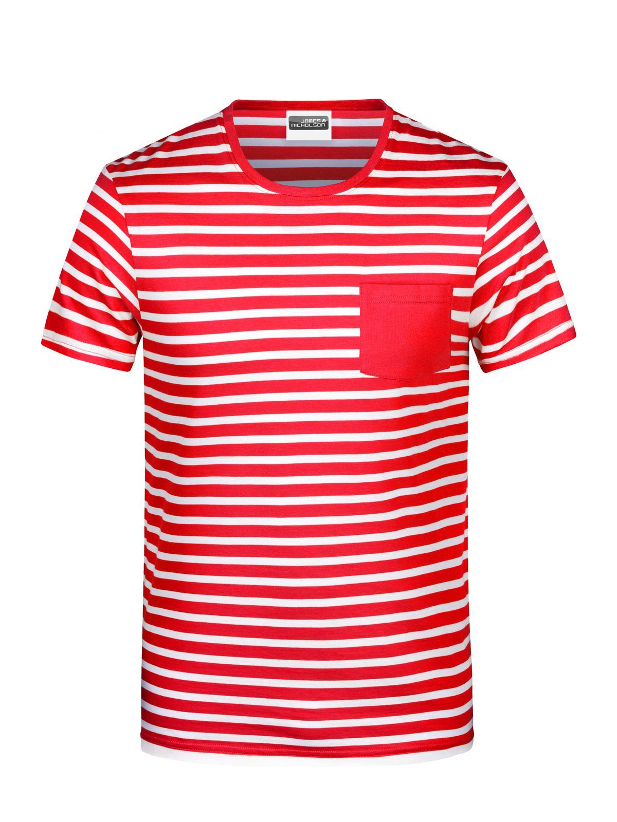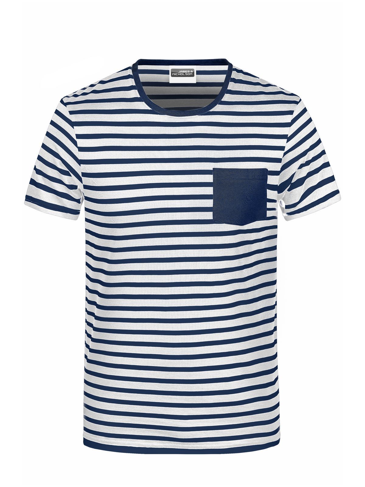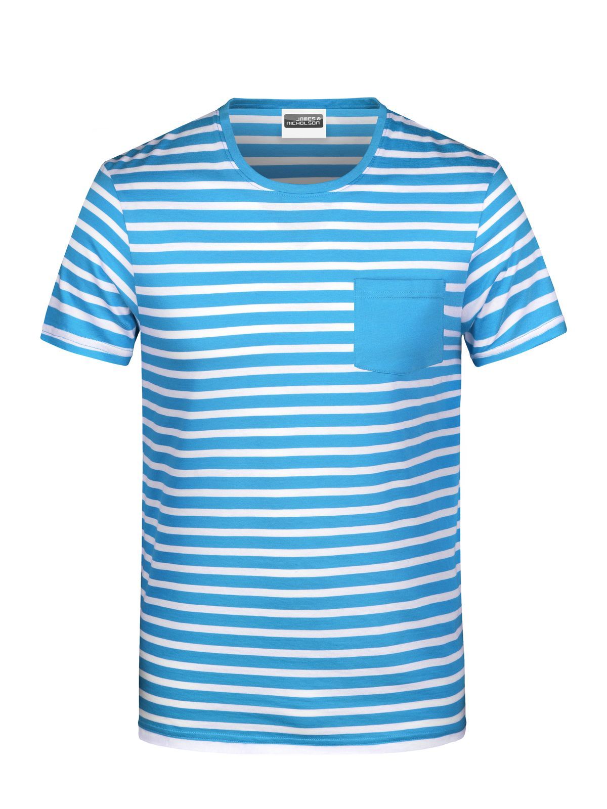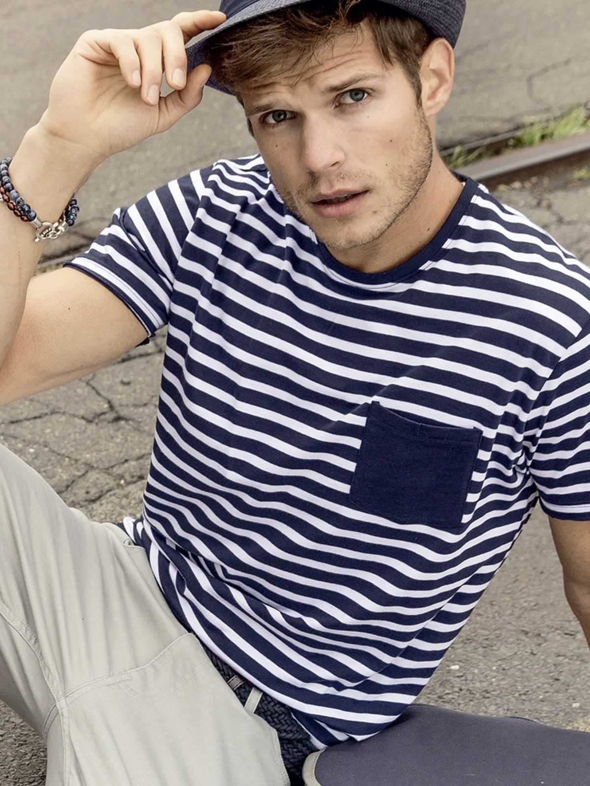 T-shirt da uomo con fantasia a righe, girocollo, taschino lato cuore, fascetta al collo con elastan, etichetta strappabile.