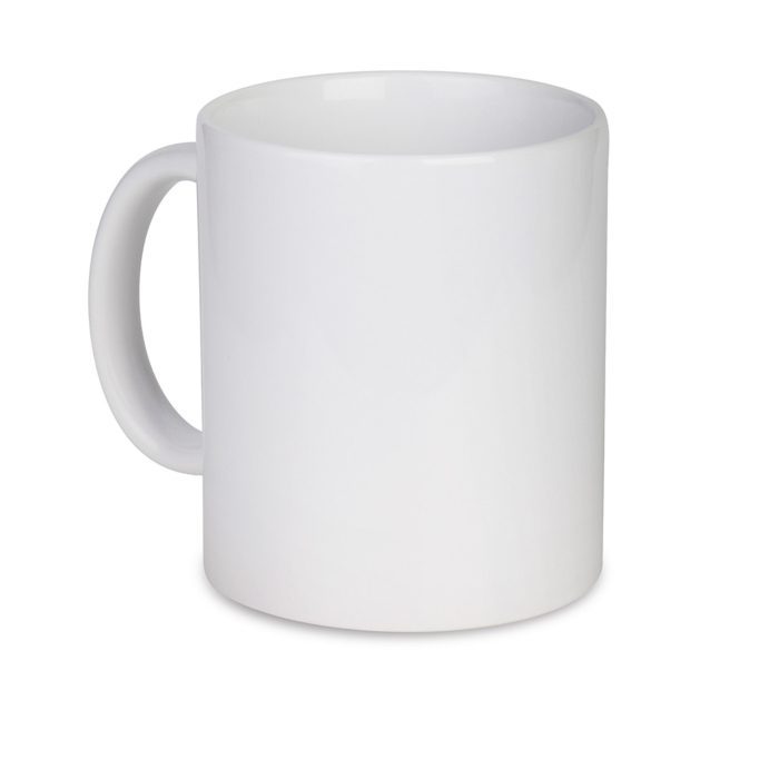 Tazza bianca, adatta per la stampa in sublimazione. Grandezza area 8,2×9,6cm, area di stampa massima 55cm. Minimo d’ordine 36pz.